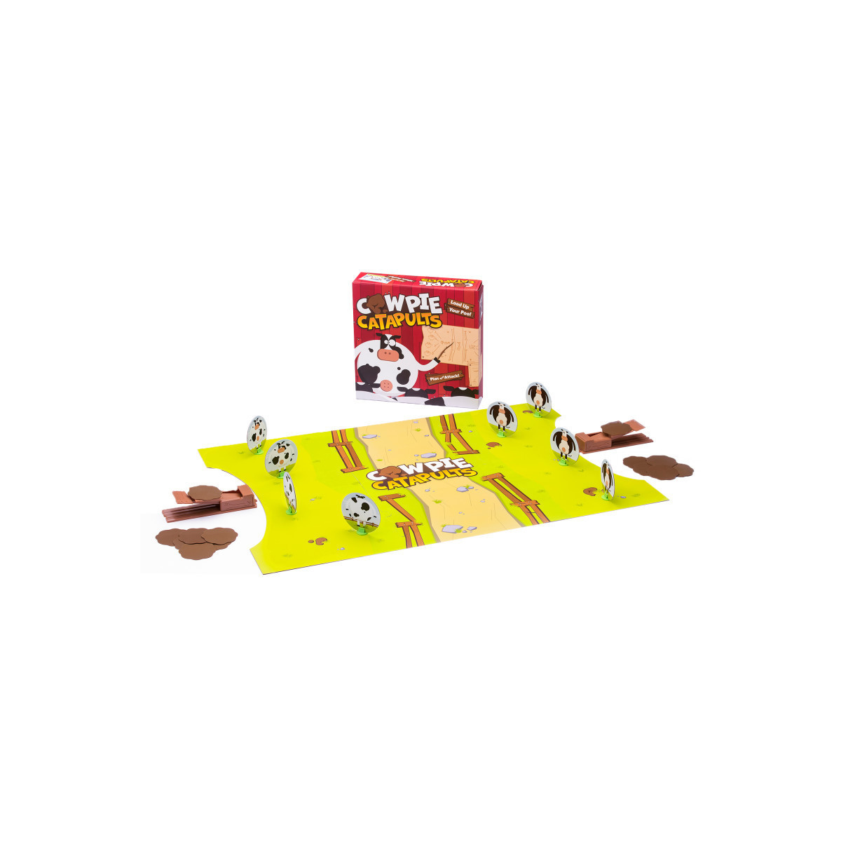 It's Cow Pie Catapults - the poo flippin', cow tippin' battle of the barnyard! Arrange your cows on your side of the barnyard, load up the catapults, and let the fun begin! On 3 - 2 - 1 poo is launched through the air and lands with splendid splats. First player to knock over all the opponent's cows is the winner!