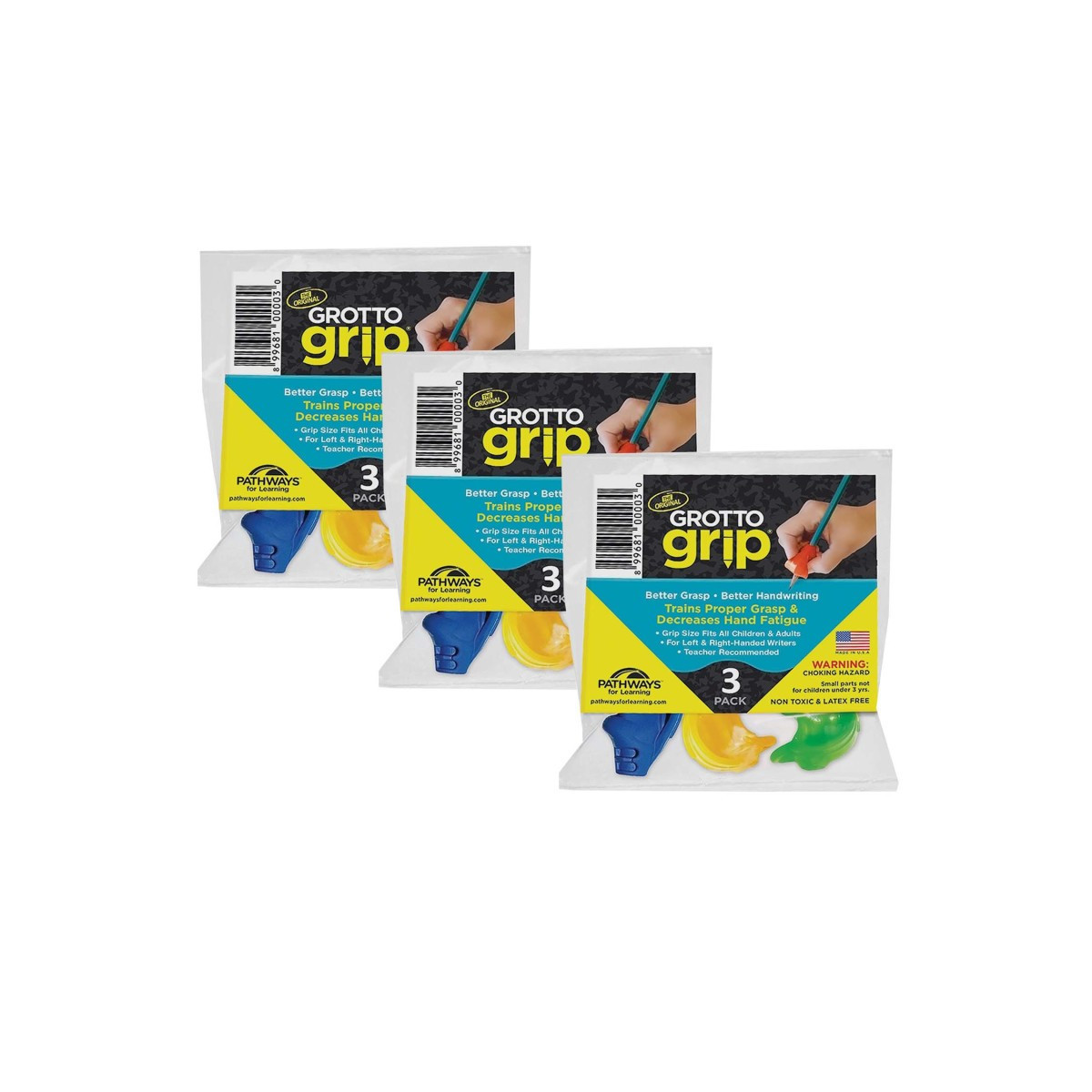 This patented, ergonomic pencil grip was designed and tested by pediatric occupational therapists who specialize in handwriting. The Grotto Grip immediately decreases hand fatigue and pencil pressure. With consistent use, the Grotto Grip® trains the hand to form a proper grasp. Other leading ergonomic pencil grips may feel comfortable but they support the hand at the finger joints encouraging whole arm and hand movements; encouraging a static grasp pattern rather than the use of dynamic finger movements, which can lead to more precision and increased writing speed. The Grotto Grip® activates the muscles in the palm of your hand to allow for dynamic finger movements. The Grotto Grip® was designed with optimal firmness to provide sufficient feedback to the fingers, which will help maintain a proper grasp while writing. Grips that are too soft, lack finger guards, or place fingers too far from the pencil point may reinforce improper grasp habits. The Grotto Grips® unique design places the hand and fingers in a position which shifts the support to the palm of the hand and facilitates the user to hold the wrist in an extended position; the proper way to hold a writing utensil. Each pack includes 3 Grotto Grips in assorted colors. Sold as a set of 3 packs, 9 Grotto Grips total.