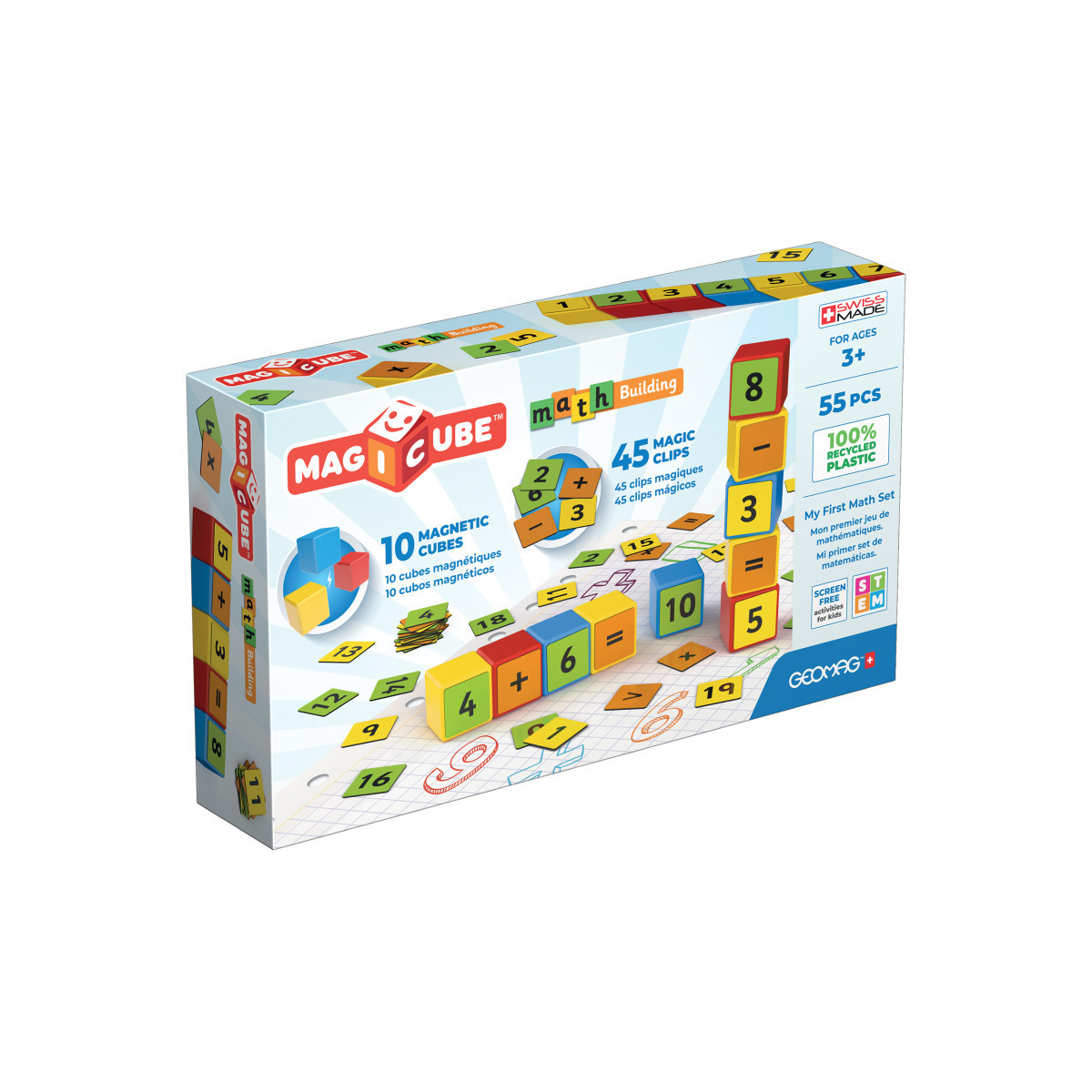 Watch your toddler learn and begin to understand numbers, symbols and build their first mathematical equations. Children will also have the ability to build different shapes, color combinations and 3D structures using Geomag Magicube Math Building 55 pieces that are uniquely designed to connect on all sides and made with 100% recycled plastic. This set contains 10 magnetic blocks and 45 non-magnetic clips. STEM.org authenticated, Magicubes help in the development of creativity, fine motor skills in addition to stimulating imaginative play and curiosity through the science of magnetic construction. Includes 10 magnetic blocks in green, blue, red and yellow, and 45 magiclips (not magnetic) that stick to the magnetic Magicube.