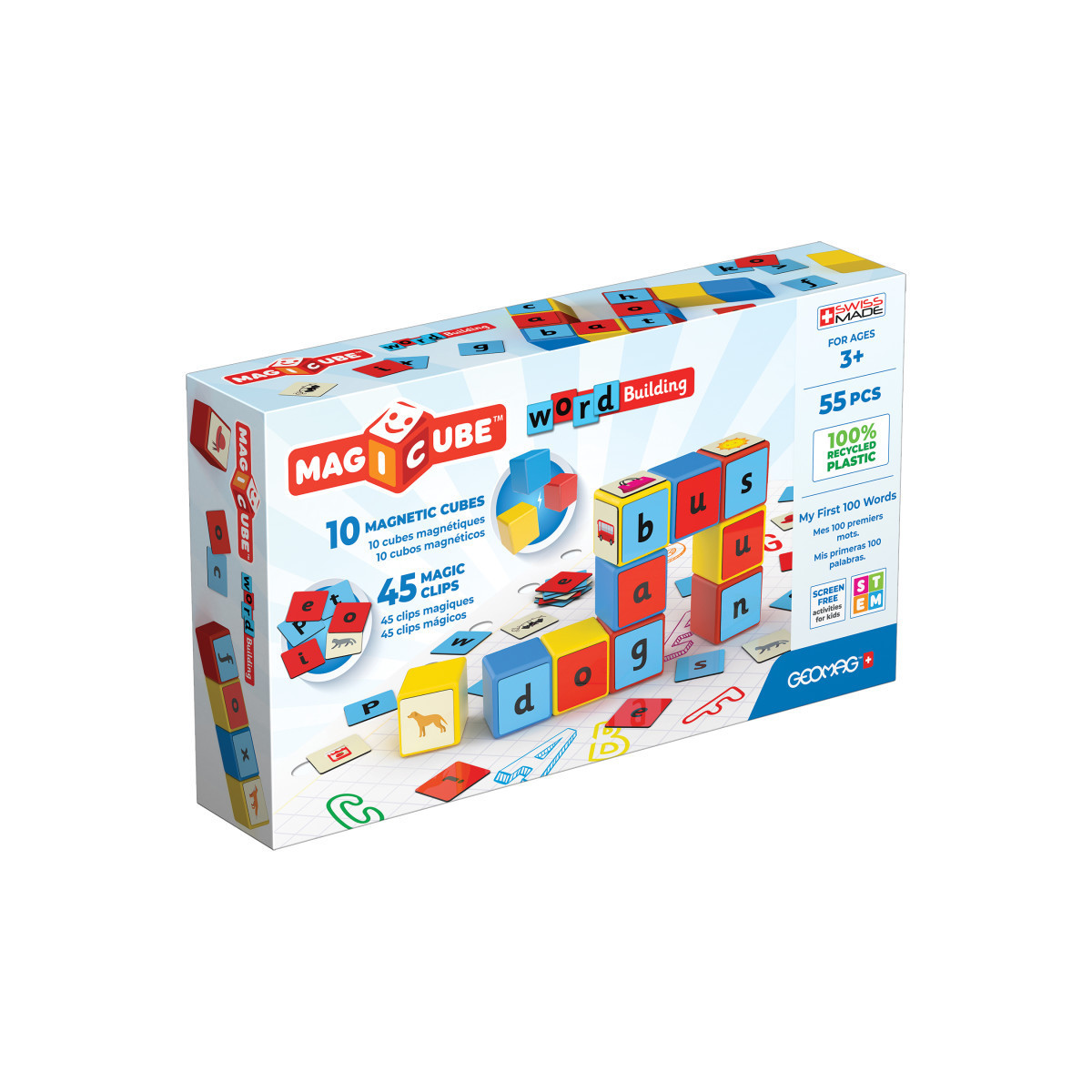 Watch your toddler learn and begin to distinguish letters, build their first words and match to an image. Children will also have the ability to build different shapes, color combinations and 3D structures using Geomag Magicube Word Building 55 pieces that are uniquely designed to connect on all sides and made with 100% recycled plastic. This set contains 10 magnetic blocks and 45 non-magnetic clips. STEM.org authenticated, Magicubes help in the development of creativity, fine motor skills in addition to stimulating imaginative play and curiosity through the science of magnetic construction. Includes 10 magnetic blocks in green, blue, red and yellow, and 45 magiclips (not magnetic) that stick to the magnetic Magicube.