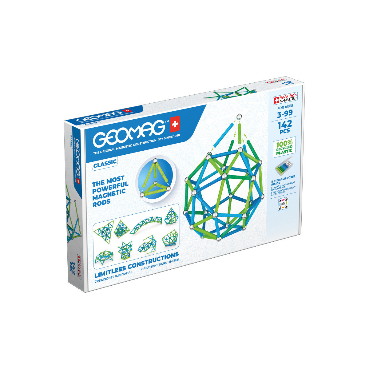 Made with 100% recycled plastic, Geomag Green line uses powerful magnetic rods and steel spheres allowing children to create unlimited structures. Powerful magnets, quality materials, strong constructions, great colors: 100% Geomag. Great introduction to STEM activities. Includes 142 pieces.