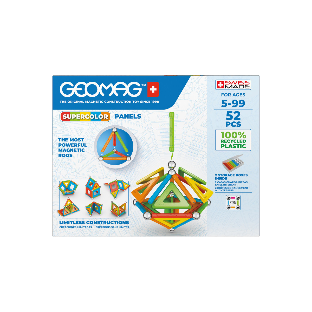 Made with 100% recycled plastic, Geomag Supercolor Panels 52 pieces use powerful magnetic rods, steel spheres and panels, allowing children to create unlimited structures. Panels provide a way to create rigidity in every structure thus allowing taller and larger structure to be built. Great introduction to STEM activities. Designed to help stimulate children's creativity by allowing for expanded play possibilities and promotes hands-on learning by offering a creative approach to problem-solving. Helps in the development of fine motor skills with endless construction possibilities.