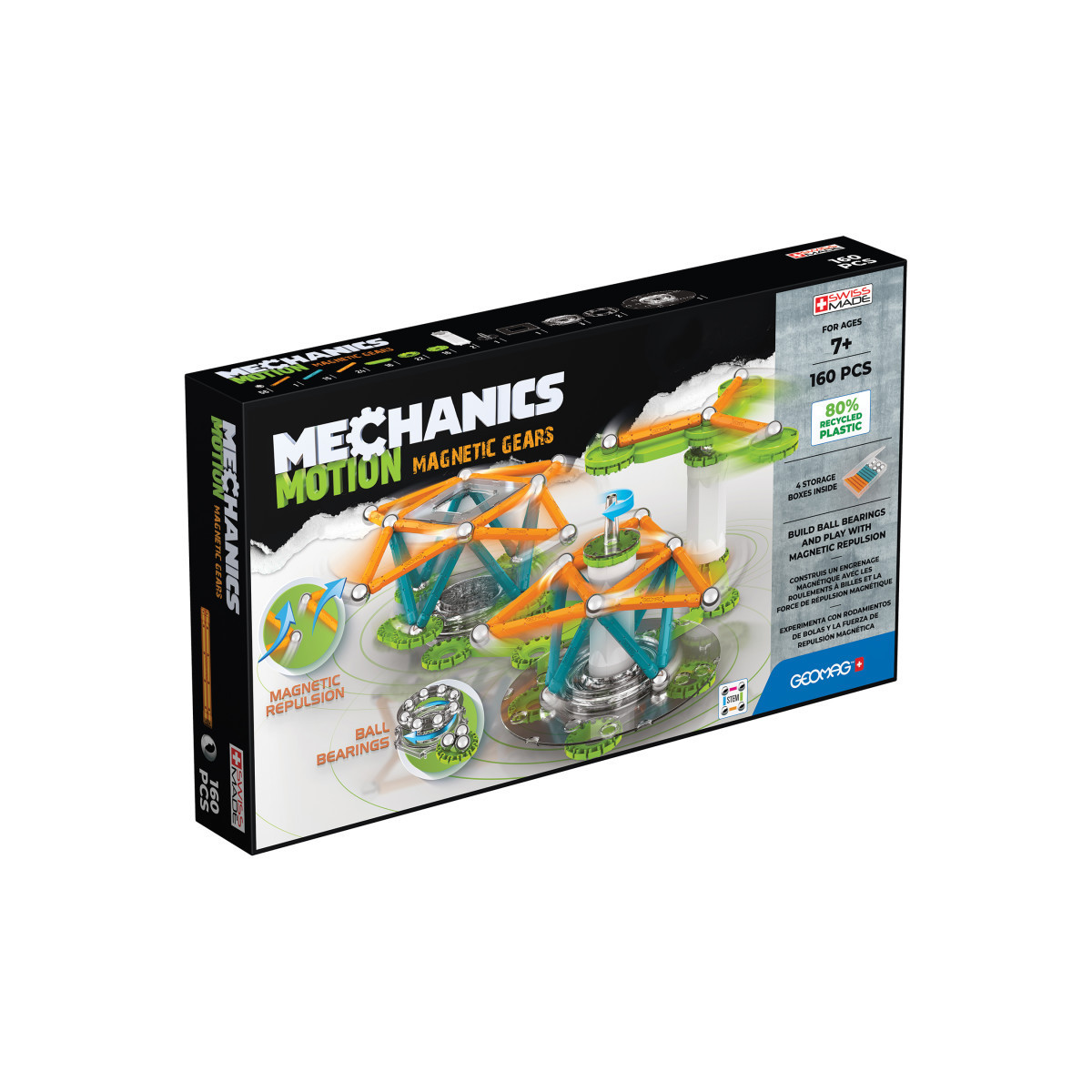 Made with recycled plastic, Geomag Mechanics Motion Gears Recycled 160 pieces combine the force of magnetism with mechanical construction. Geomag Mechanics Motion Compass 160 pieces stimulate children's creativity, inventiveness and a hands-on approach to problem-solving. In addition to magnetic rods and steel spheres, Geomag Mechanics adds mechanical elements within the construction platform that allows for expanded play possibilities. Structures rotate by triggering chain reactions using magnetic attraction and repulsion. STEM.org authenticated toy that helps in the development of creativity, fine motor skills in addition to stimulating imaginative play and curiosity through the science of magnetic construction.