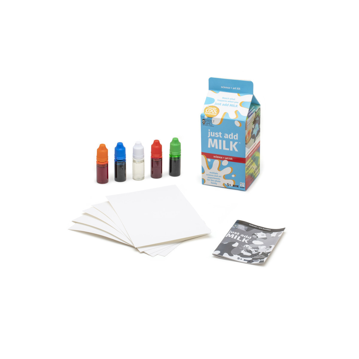 Just Add Milk makes science and art at home easy by using supplies you already have. This kit comes loaded with everything you need for at-home science and art experiments, all you need to do is add the missing ingredient. Just add Milk encourages a curiosity for science combined with a love for experimenting with art. More than 8 science and art activities including Magic Milk, Milk Painting and so much more! Discover Surface Tension, Weakening Molecular Bonds, and Density Of Liquids. This kit features instructions in English, Spanish and French. Designed for kids ages 5 and up.