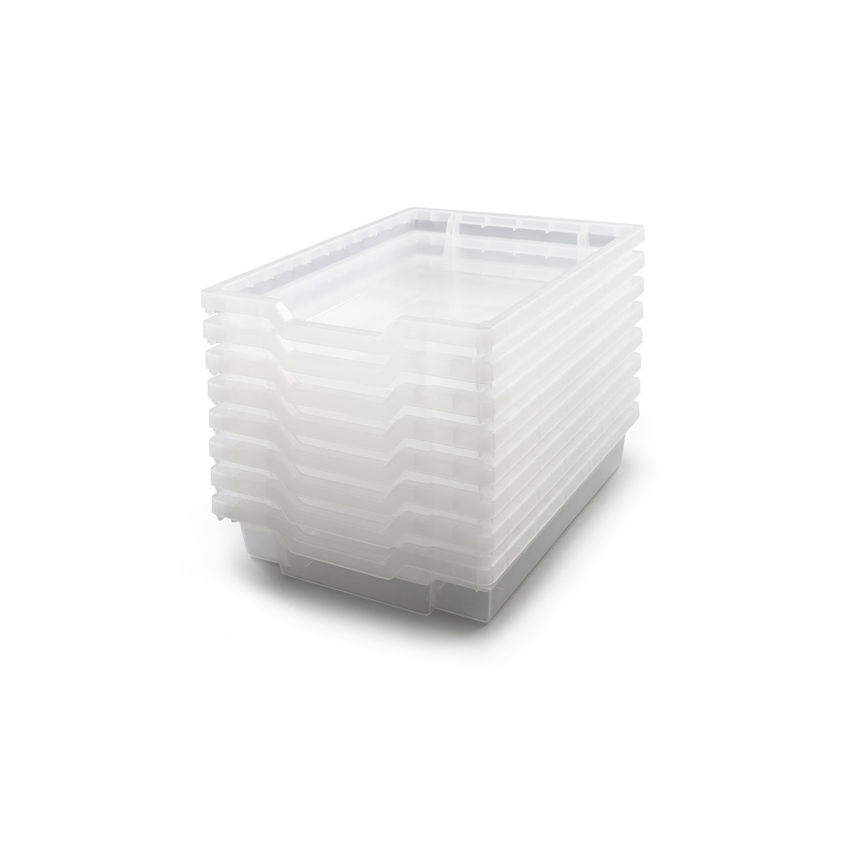 Gratnells Shallow Tray fits all standard school furniture. These storage trays are molded in polypropylene with no rough edges and are fully stackable. Colorfast and chemical resistant. Feature a built-in carry handle. Fully recyclable and come with a 5 year guarantee. Perfect for many other uses such as home, office and industrial. Tray measures 12.3" x 16.8" x 3". Pack of 8 trays.