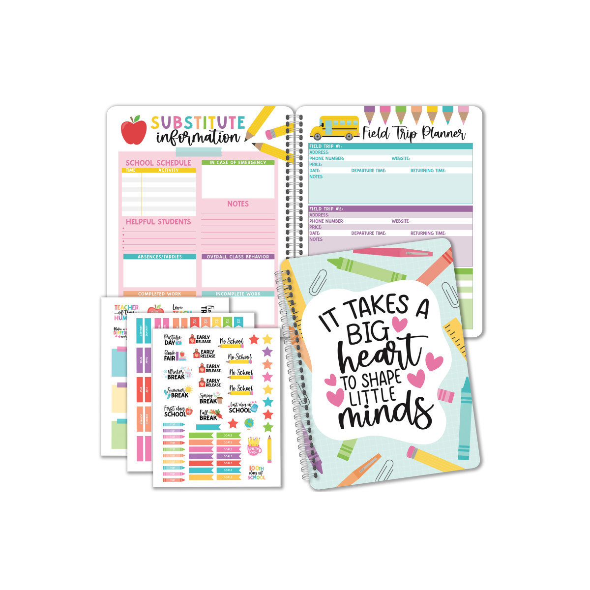 Stay organized in style! you'll receive an 8x10 inch teacher planner with 12 undated monthly sections, each with space for five weekly plans per month. Plus, you'll get 3 sticker sheets, 1 substitute sheet, 1 field trip planner, 2 daily schedules, 2 student info sheets, 2 important dates sheets, 1 year review