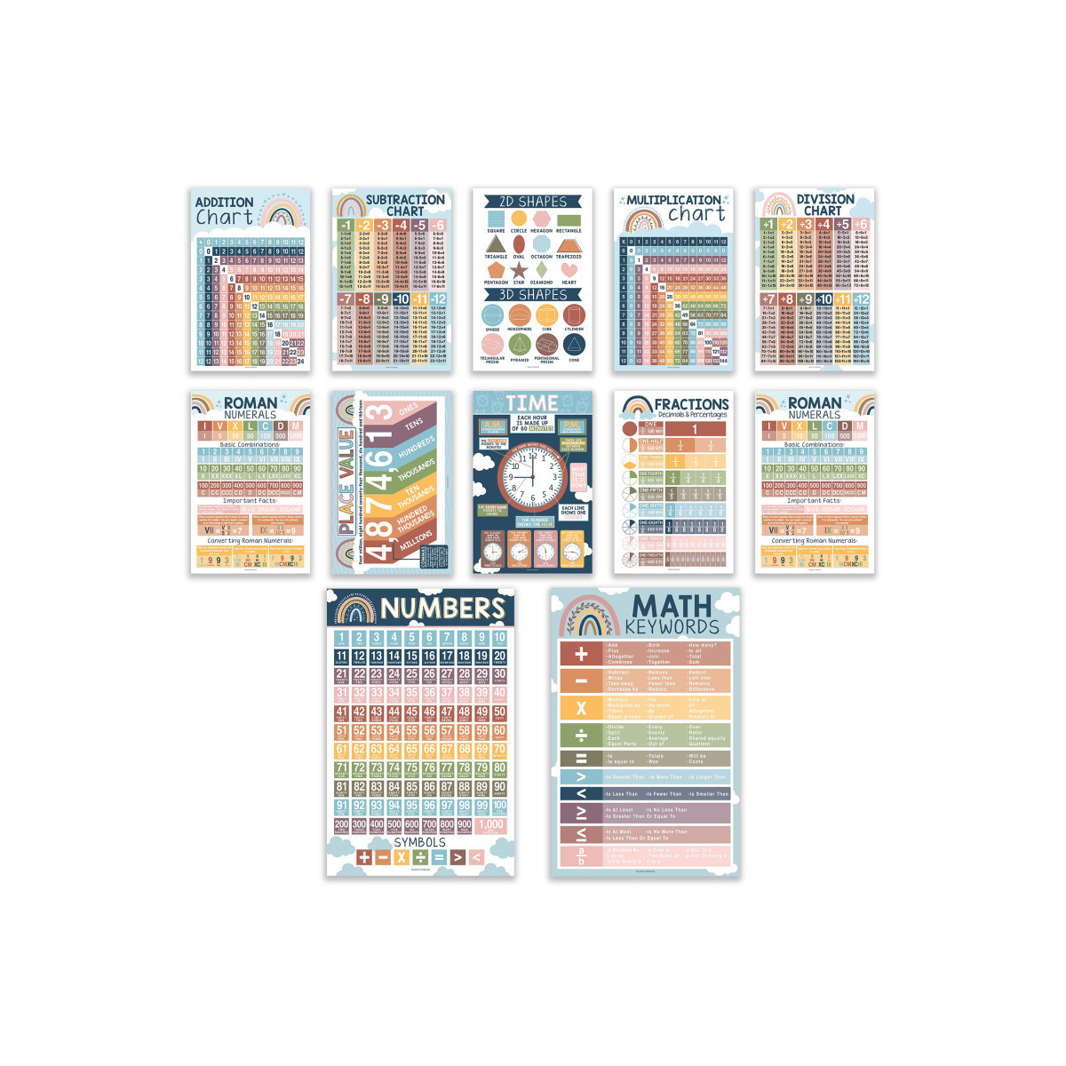 This educational chart set includes 12 different 11x17" laminated posters, so you can easily teach students addition, subtraction, division, multiplication, and SO much more! Each of our math themed learning charts comes pre-laminated, so you'll never have to worry about children damaging them. These kids learning posters also feature bright, engaging colors that capture (and keep!) kids' attention, so kids can easily soak up math topics like a sponge!