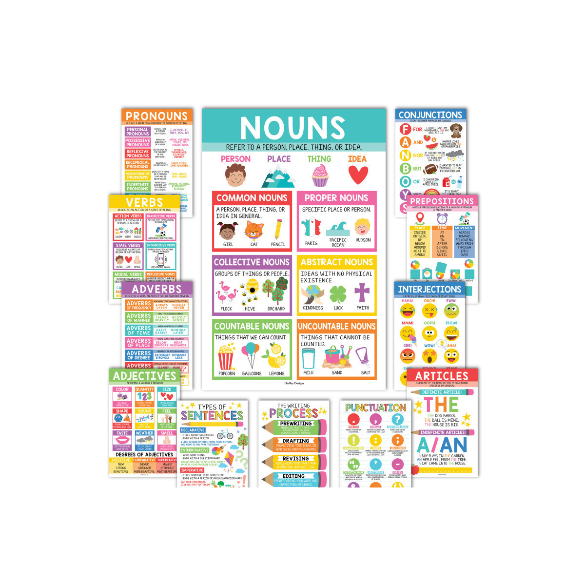 Simplify confusing grammar rules! These writing and punctuation posters for classroom make even the most complicated concepts easy to understand. Easily help students absorb information faster with these nouns verbs and adjectives posters