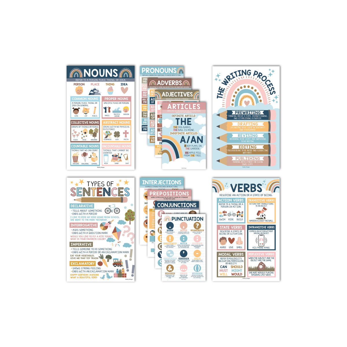 Skyrocket writing skills and confidence! Use these educational charts & posters as a language arts poster, noun poster, pronoun poster, verb poster, educational classroom posters elementary English classroom posters, or as rainbow and sun writing posters for classroom