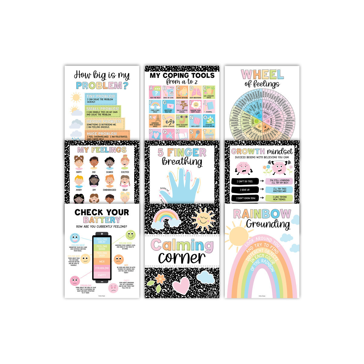 If you're looking to create a stress-free calming corner to help children cool off, then you need this colorful calming corner poster set. Our calm corner classroom decor is USA made