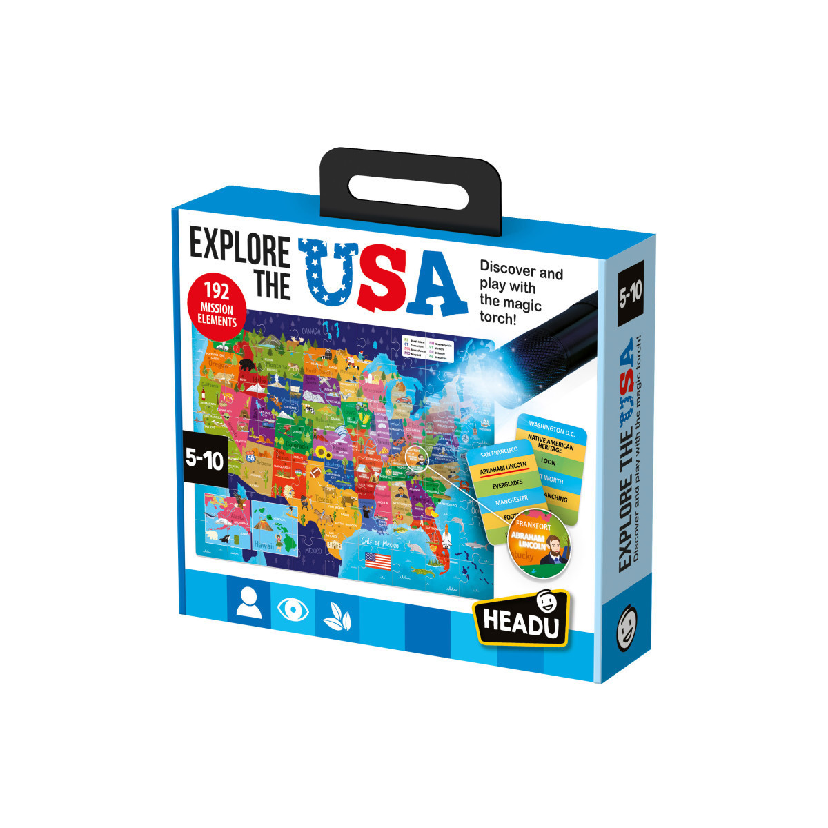 Embark on an exciting journey across the country with the Explore the USA Puzzle! This interactive puzzle helps children discover the geography, cities, and cultural landmarks of the United States in a fun and engaging way. As they assemble the map, kids can locate major cities and then use the included magic torch to reveal famous monuments, native wildlife, and other fascinating aspects of American culture. Designed in collaboration with teachers and education experts, this high-quality educational toy supports geography learning while sparking curiosity and exploration. Made in Italy with safe, durable materials, it’s a perfect way to bring the wonders of the USA to life! Includes Puzzle (63-piece, 47 x 37 cm), 16 double-sided mission cards, 1 magic torch (requires 3 x AAA batteries, not included), 1 hourglass and rules.