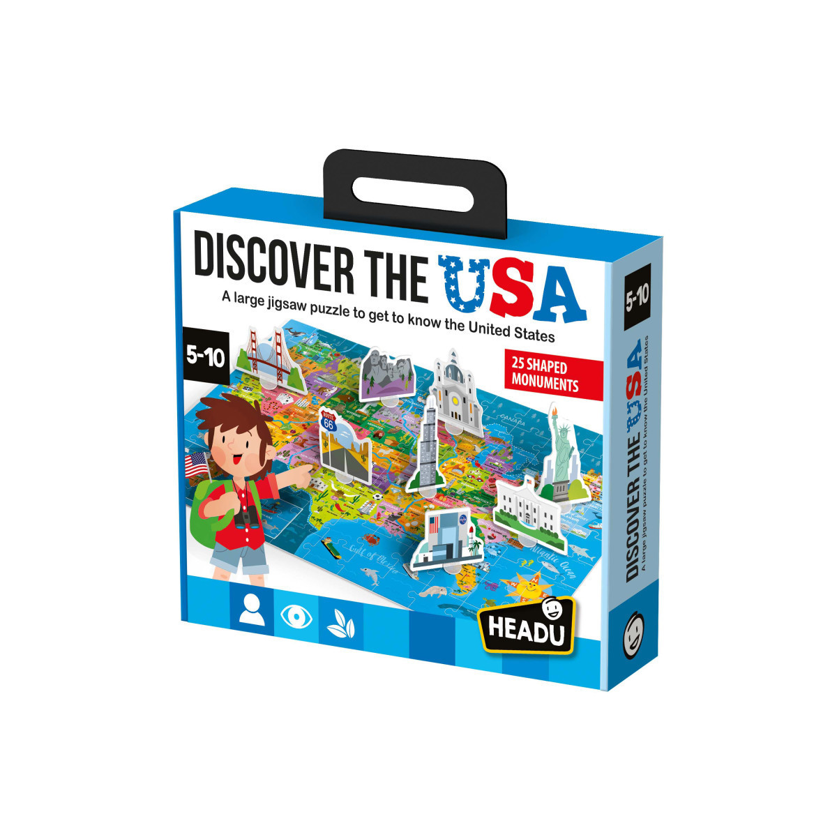 Take a fascinating journey across the country with the Discover the USA Puzzle! This large, beautifully illustrated jigsaw puzzle introduces children to the geography, natural wonders, and cultural landmarks of the United States. As they piece together the map, they’ll learn about state capitals, major cities, and regional wildlife. Plus, with 25 monument pieces, kids can place famous landmarks in their correct geographical locations, making learning even more interactive and engaging. Designed in collaboration with teachers and education experts, this high-quality puzzle is made in Italy using safe, durable materials—perfect for young explorers eager to discover the wonders of the USA! Includes Large (60 x 44 cm), 108-piece geopolitical puzzle, 25 shaped monuments and 25 plastic card stands.