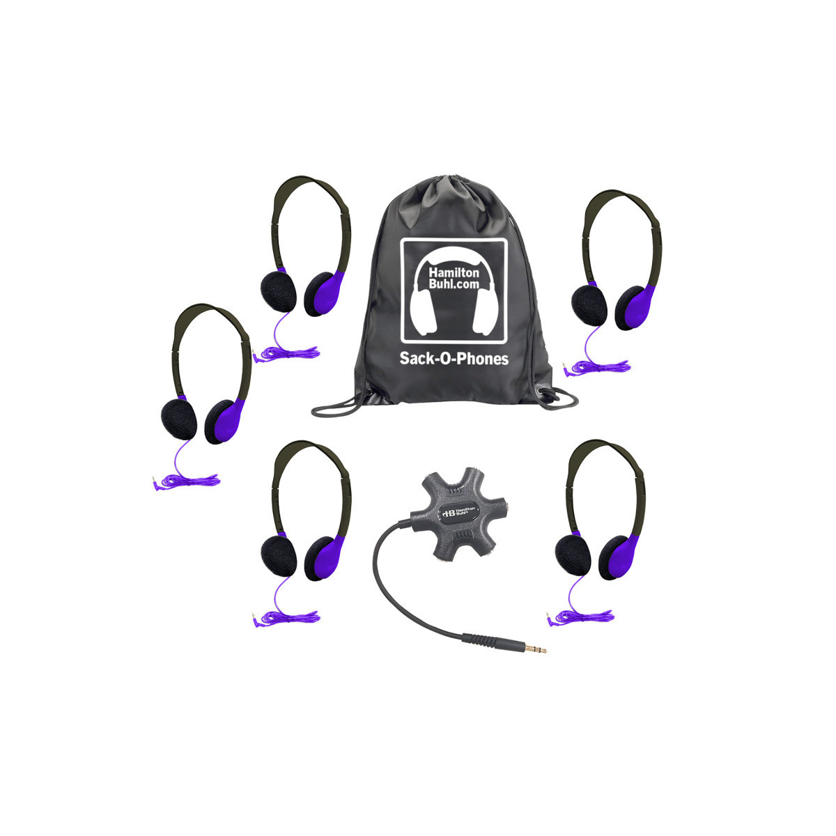 HamiltonBuhl® Galaxy™ Econo-Line of Sack-O-Phones with 5 Purple Personal-Sized Headphones, Starfish Jackbox and Carry Bag