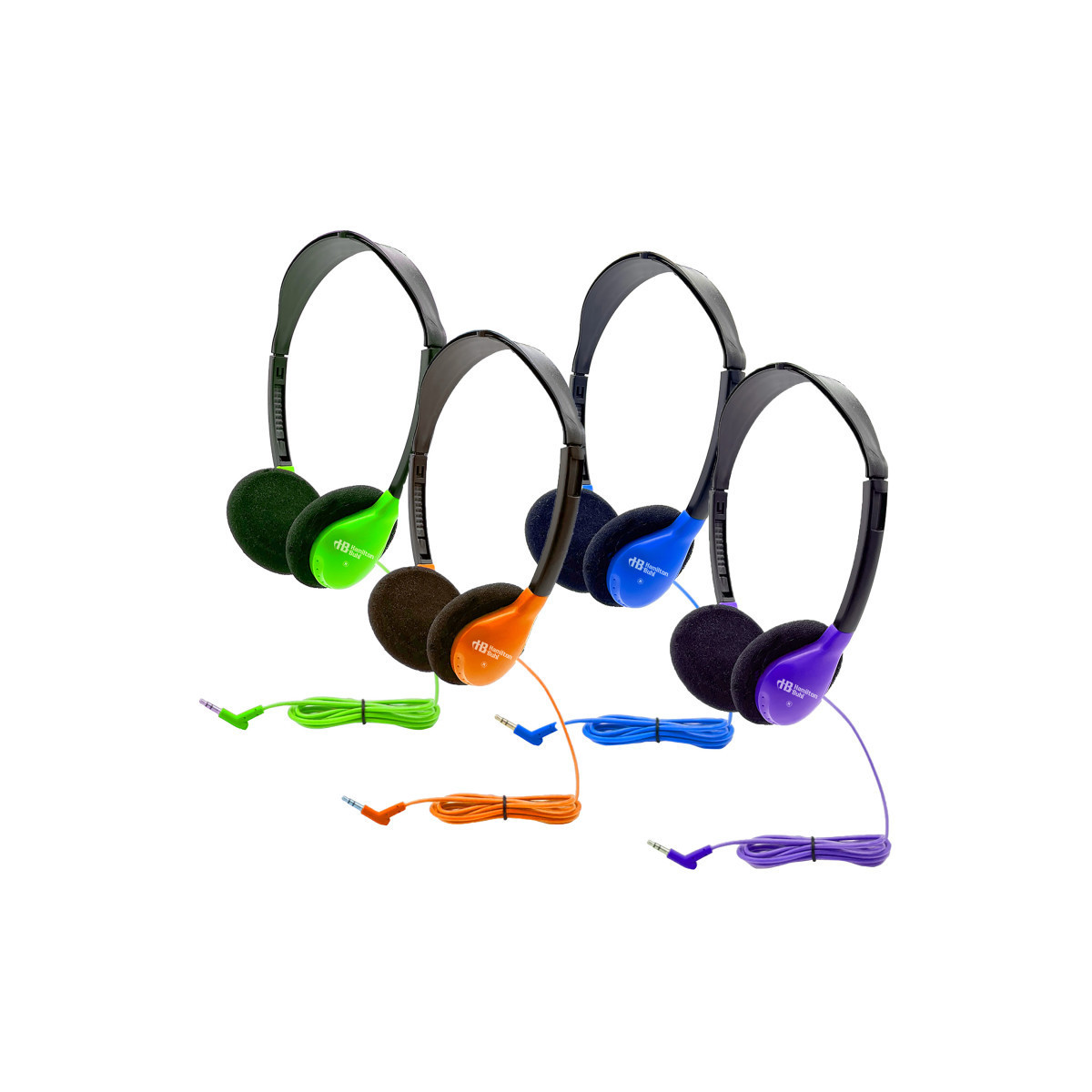 Set of 4 Personal On-Ear Stereo Headphones in assorted colors: Blue, Green, Orange and Purple. The HamiltonBuhl personal on-ear headphone is the ruggedly constructed, robust yet lightweight headphone ideal for today's tech filled classrooms. With the ever growing classroom technology, each student needs a high quality, durable yet comfortable headphone to get the most out of their high tech lessons and the HA2 headphone not only provides rugged durability and high quality sound, but the lightweight, on-ear design allows for all-day comfort and easy compact storage.