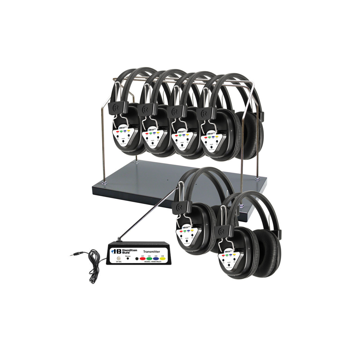 Go wireless in your classroom with plug-and-play simplicity. This 6-person Wireless Listening Center is perfect for all multimedia, lab and classroom applications. Each system includes one transmitter, six wireless headphones and a sturdy steel headphone rack to store your headphones. The entire system can be switched between 4 different frequencies with easy color-coded switches. Add additional transmitters and you'll have up to 4 different channels of audio simultaneously!