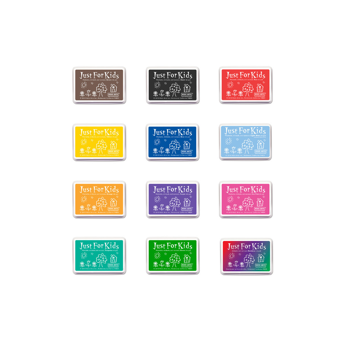 Child-safe inks are ideal for younger stampers as they are water-based, kid-safe and non-toxic. The impressions fade into the paper and work best on non-glossy surfaces. A colorful collection featuring 12 full sized ink pads from our best selling Just for Kids Ink line. Includes one of each of the following: