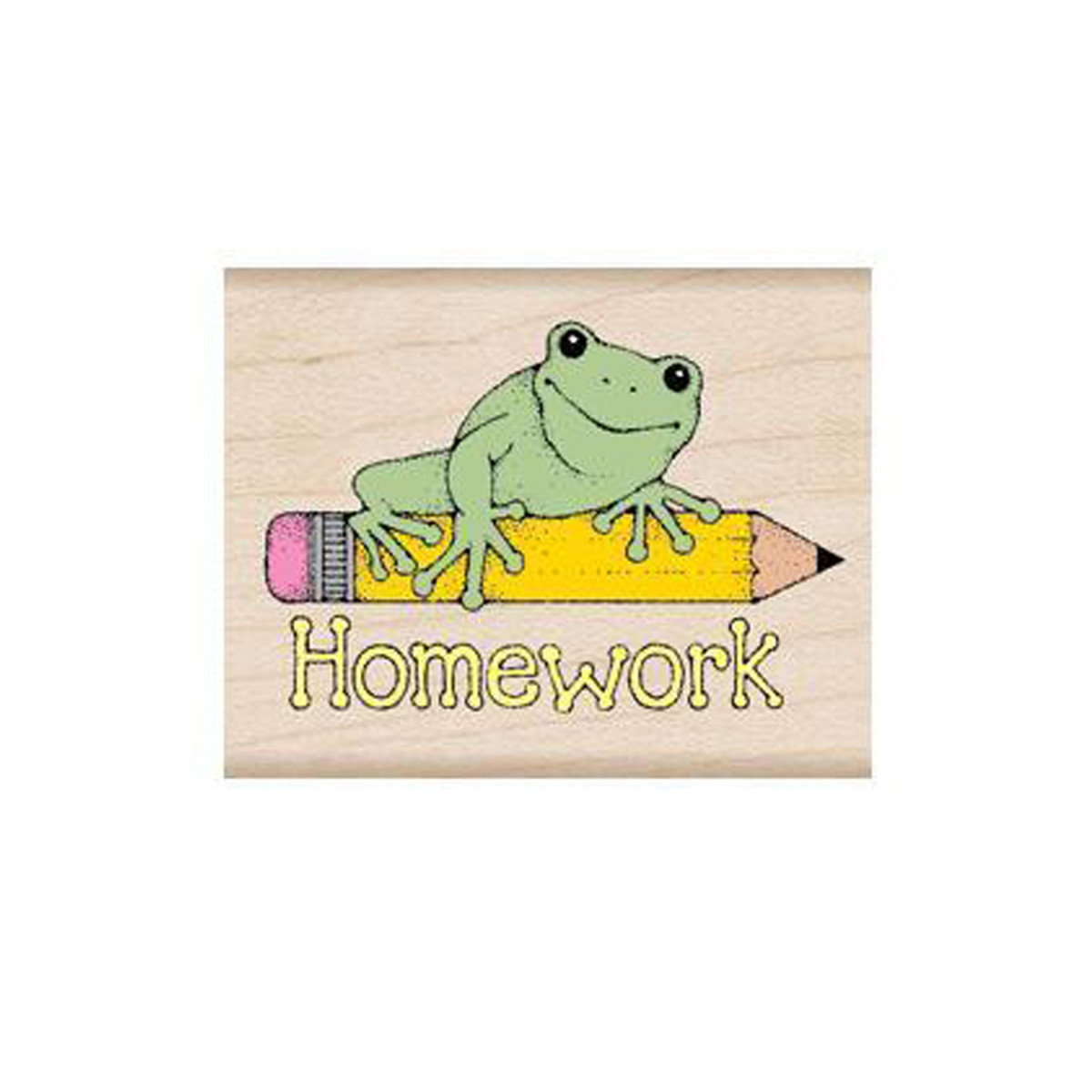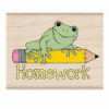 Adorable stamp featuring a frog atop a pencil, pointing out homework. Great for teachers, students and homeschoolers.