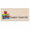 This stamp features a stack of books with an apple on top and a line for parent signature.