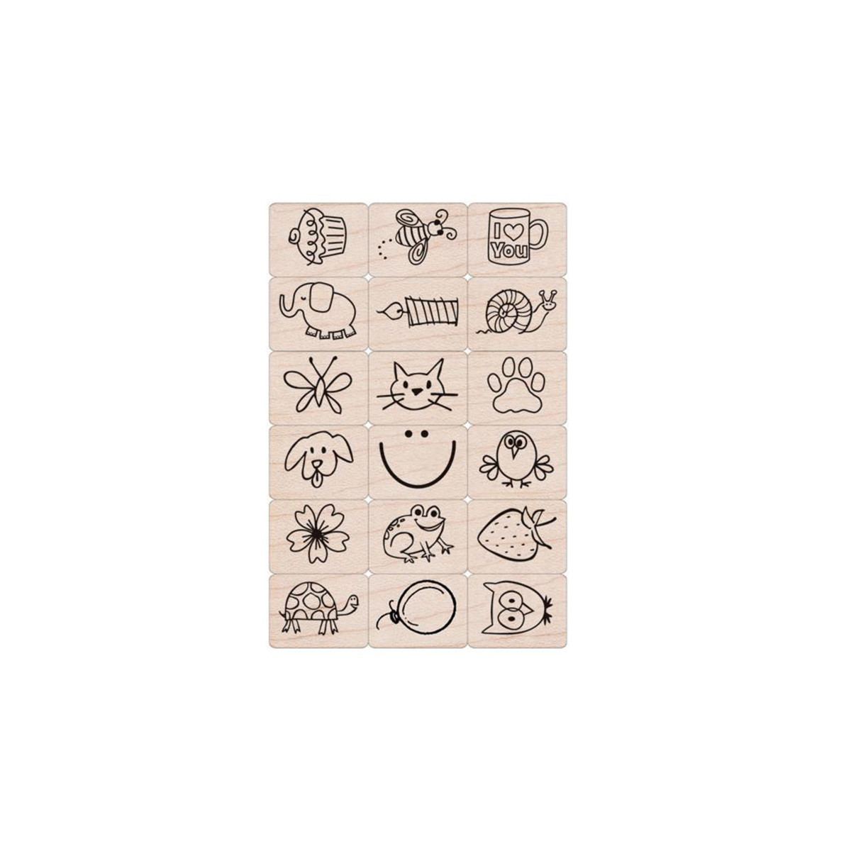 Our Ink 'n' Stamp contains 18 woodblock stamps and a childsafe ink cube, all packaged in a handy tub measuring 3" x 5". Mix and match stamps to create cards and crafts. Also includes a 1" ink cube.