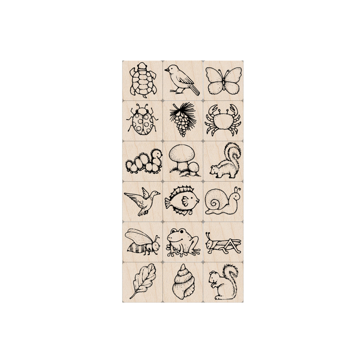 Our Ink 'n' Stamp contains 18 woodblock stamps and a childsafe ink cube, all packaged in a handy tub measuring 3" x 5". Mix and match stamps to create cards and crafts. Also includes a 1" ink cube.