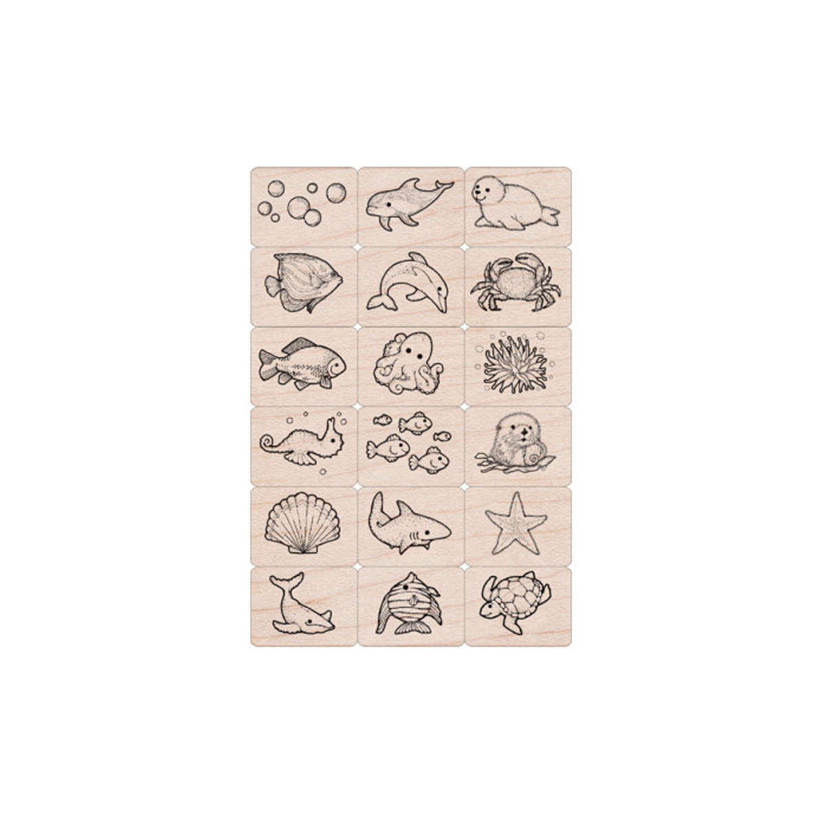 Our Ink 'n' Stamp contains 18 woodblock stamps and a childsafe ink cube, all packaged in a handy tub measuring 3" x 5". Mix and match stamps to create cards and crafts. Also includes a 1" ink cube.