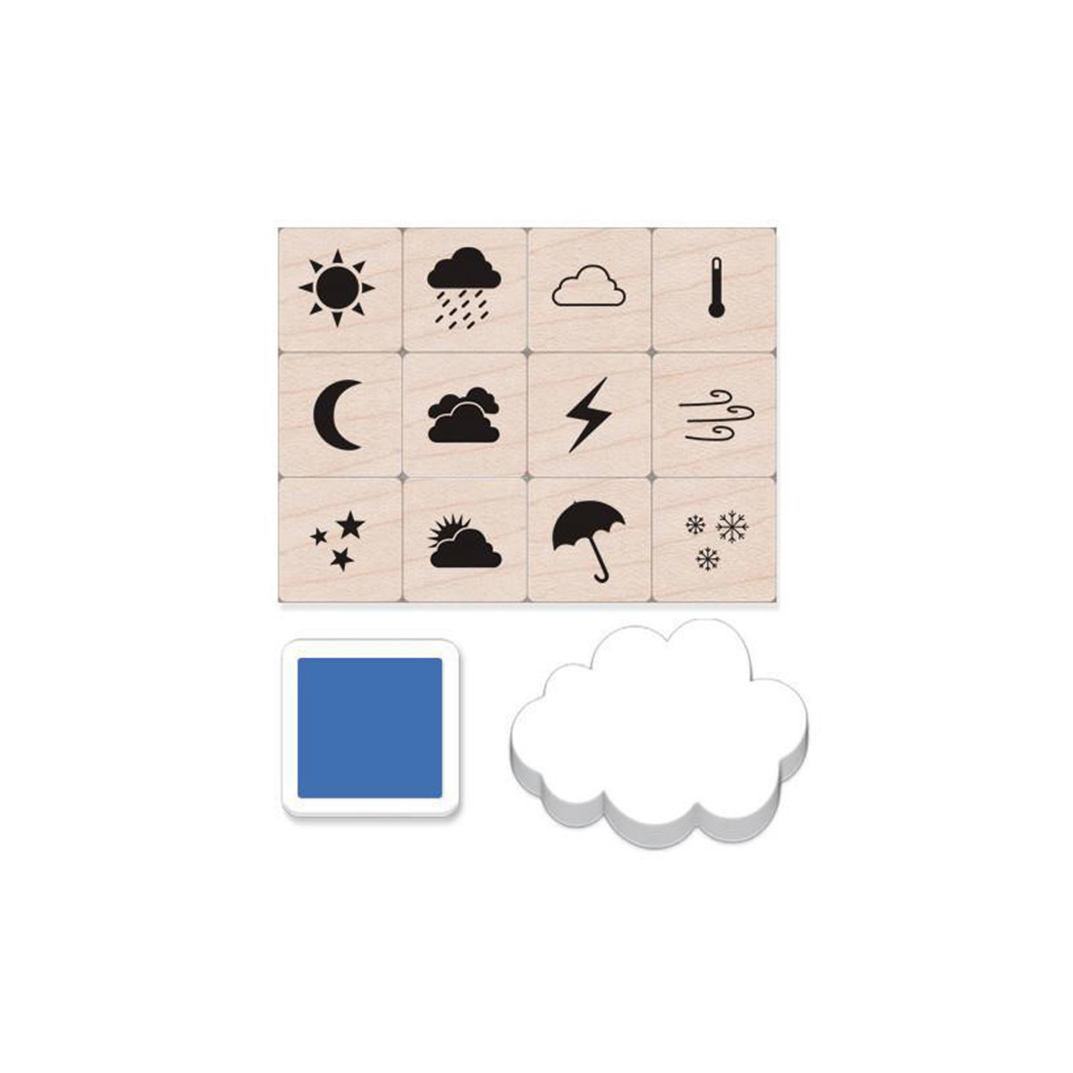 The Hero Arts Weather Icons Mini Tub contains stamps, a blue ink cube, and a cloud sticky note pad, all packaged in an adorable tub. Mix and match stamps to create fun cards and crafts. A set of 12 woodblock stamps made with deeply etched 100% red rubber.