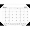 Elemental black-on-white in black holder for simplicity. January - December featuring 12 months for easy planning. Full monthly view on each page featuring 2-5/16" x 1-3/4" blocks allocated for each day. Full 12-month calendar for longer term planning. Strong black leatherette reinforced corners keep pages in place and protected. Julian dates and days remaining for quick reference. Perfect size for smaller work surfaces. Printed on 100% post-consumer recycled FSC certified paper with soy inks. Made in the USA. Measures: 18-1/2" x 13".
