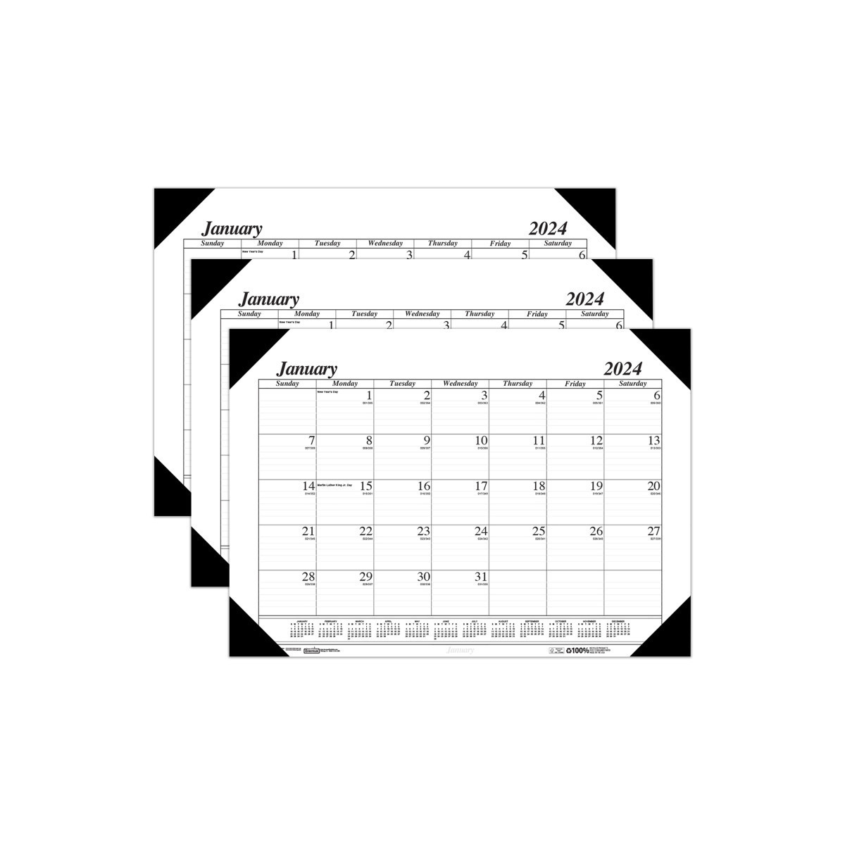 12 Month Calendar: January - December. Full Calendar Year Along The Bottom. Refillable 4 corner holder. Four reinforced black leatherette corners. Includes Julian dates and days remaining. Printed on 100% post-consumer recycled paper with soy ink. Made in the USA. Sold as a pack of 3 desk pads.