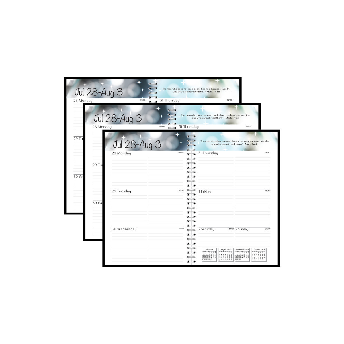 An ideal assignment book that is designed for a student in high school or college printed in full color. Each planner includes 13 Months: August - August. One week per two-page spread for high school and college students. Extra pages feature US Presidents, State Capitals, parts of speech, commonly confused words listing etc. Black leatherette cover. Academic and environmental pages. Printed on 100% post-consumer recycled paper with soy ink. Measures: 5" x 8". Sold as a pack of 3 identical books.