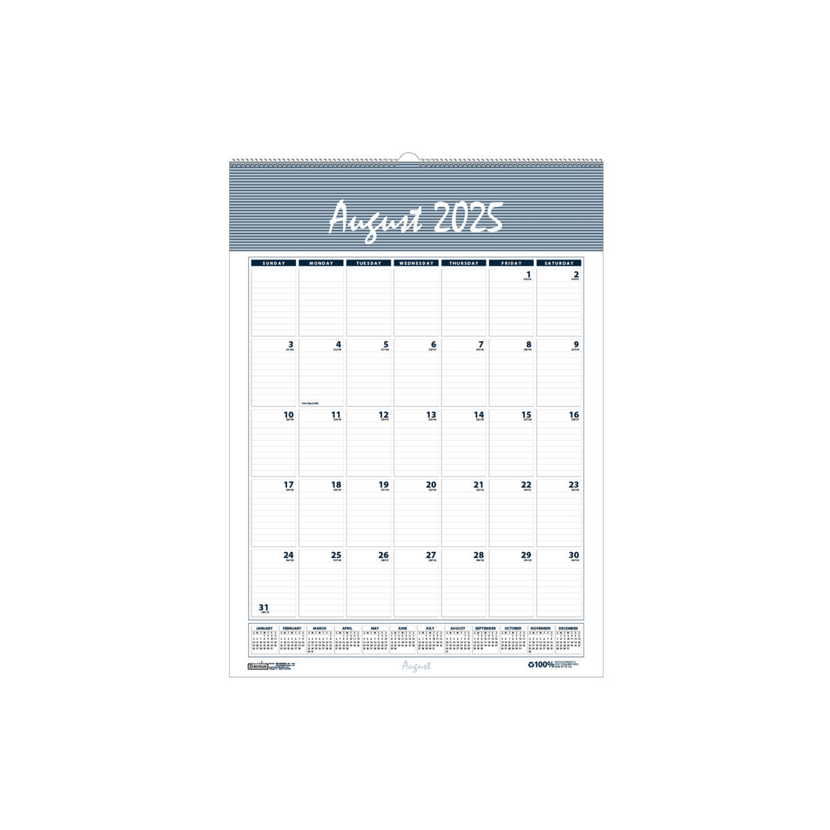 Academic Wall Calendar: August - July. Spiral bound with hanger. Measures 12" x 17". Block size: 1 1/2" x 2 1/4". Full year reference calendar on each month printed In Wedgwood blue and gray. Full chipboard backer. Printed on 100% post-consumer recycled paper. Made in USA
