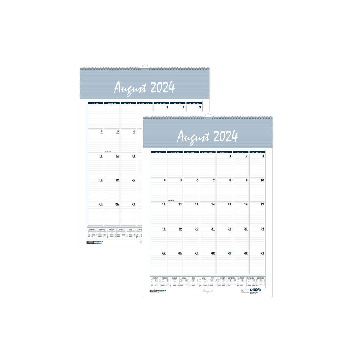 Academic Wall Calendar: August - July. Spiral bound with hanger. Measures 12" x 17". Block size: 1 1/2" x 2 1/4". Full year reference calendar on each month printed in Wedgewood blue and gray. Full chipboard backer. Printed on 100% post-consumer recycled paper. Made in USA. Sold as a pack of 2 calendars.