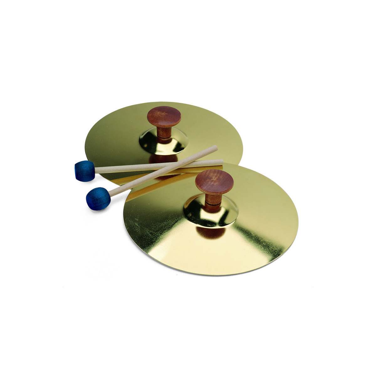 Brass cymbals have big wooden knobs for easy gripping and a wooden mallet that dampens the sound into a lovely bell tone