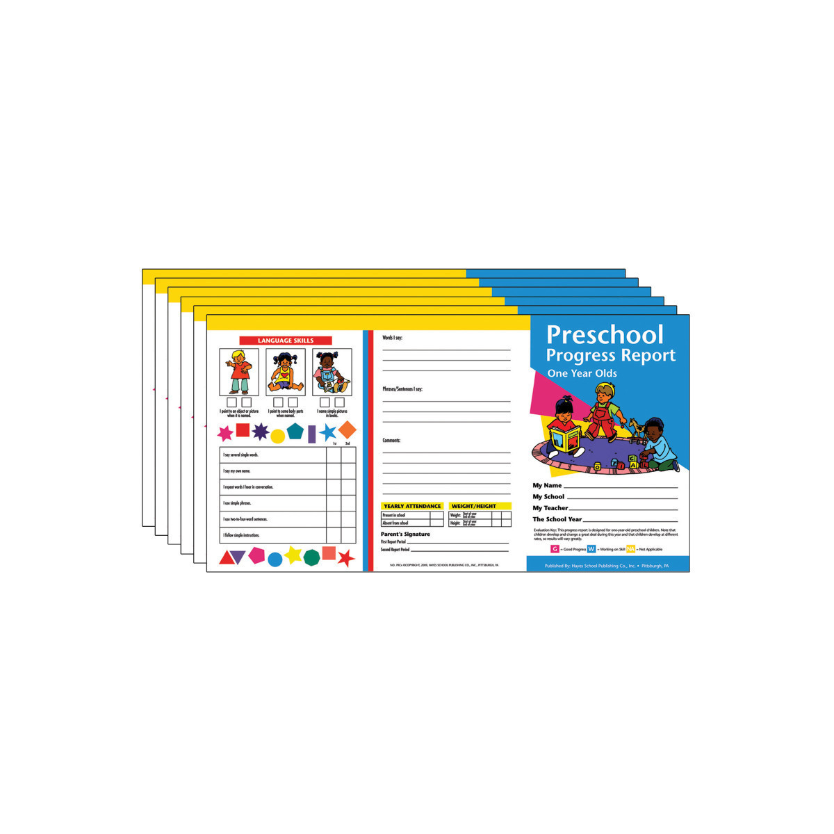 Colorful, easy-to-read Hayes reports help parents appreciate the progress their children have made. Areas include social and emotional skills, gross motor skills, fine motor skills, and language skills. Evaluation Reports are 2 sided, full-color tri-fold sheets. Closed reports measure 5" x 8". Each pack includes 10 reports. Sold as 6 packs for a total of 60 reports.