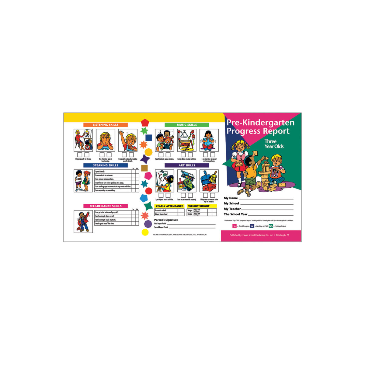 - These progress reports provide a detailed listing of achievements for the pre-kindergarten year in various curriculum areas.