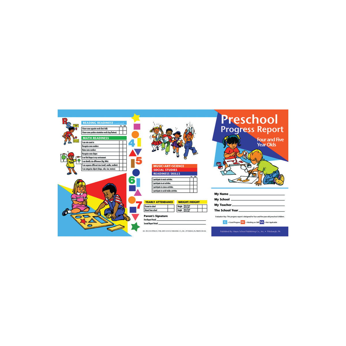 Preschool Progress Reports designed for 4 and 5 years olds provide a detailed listing of achievements in various curriculum areas. Colorful, easy-to-read Hayes reports help parents appreciate the progress their children have made. Areas include self-reliance skills, practical skills, social and emotional skills, work habits, listening and speaking skills, fine motor skills, gross motor skills, reading and math readiness and music, art, science, and social studies readiness skills. Reports are 2 sided, full-color tri-fold sheets. Closed report measures 5" x 8". Each pack includes 10 reports.