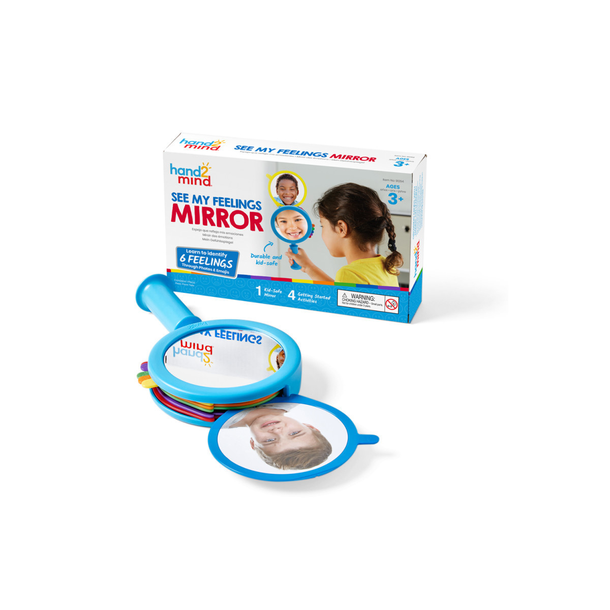 The child-friendly mirror helps children recognize and identify with different pictured emotions in themselves and others