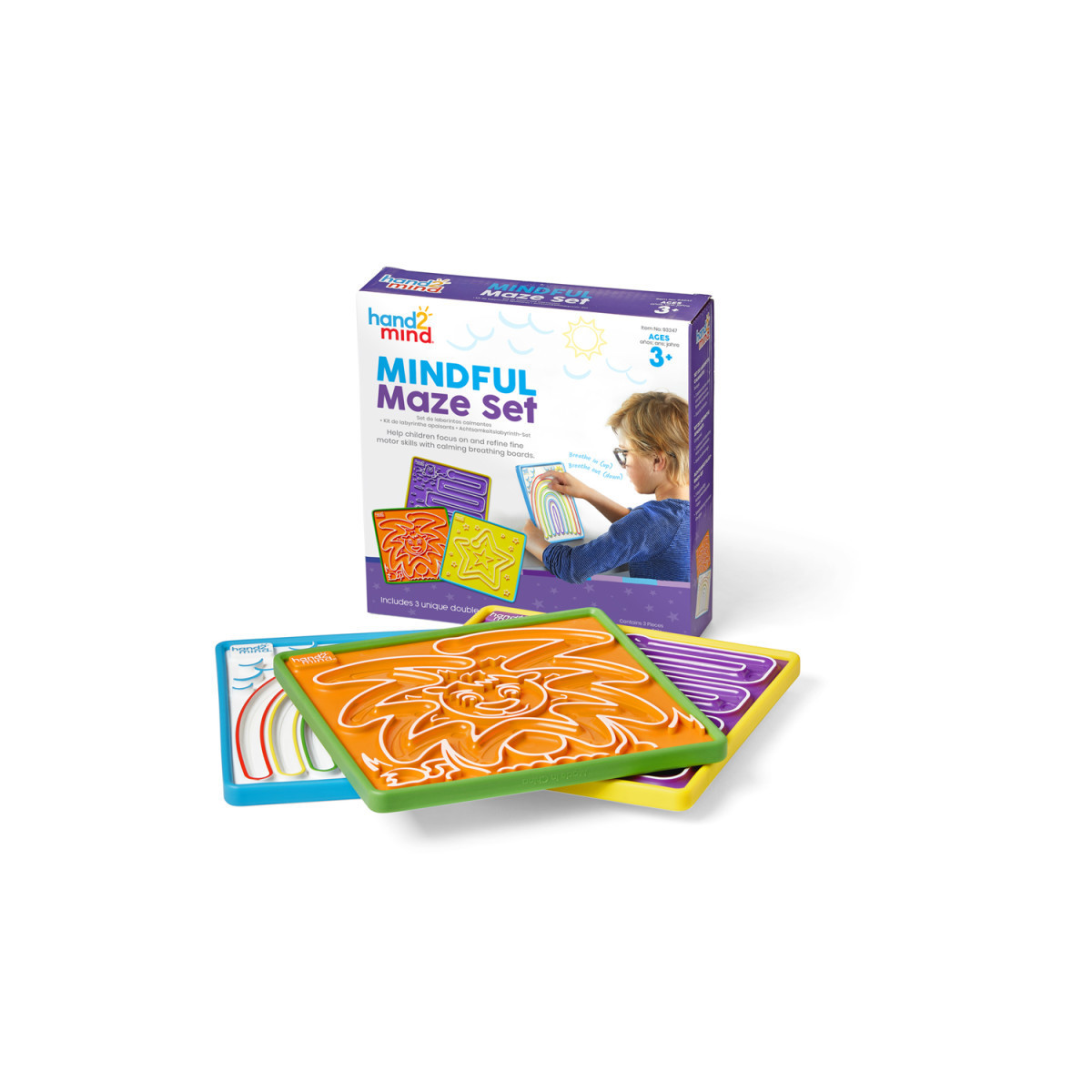 Help develop mindfulness and self-management skills. Mindful Maze Boards support social emotional learning and mindfulness by providing a hands-on, easy-to-use tool to develop self-management skills. Set includes 3 double-sided boards with indented finger paths. The finger paths incorporate tactile prompts for inhaling, exhaling, and pausing to guide the child through the breathing exercise from start to finish.