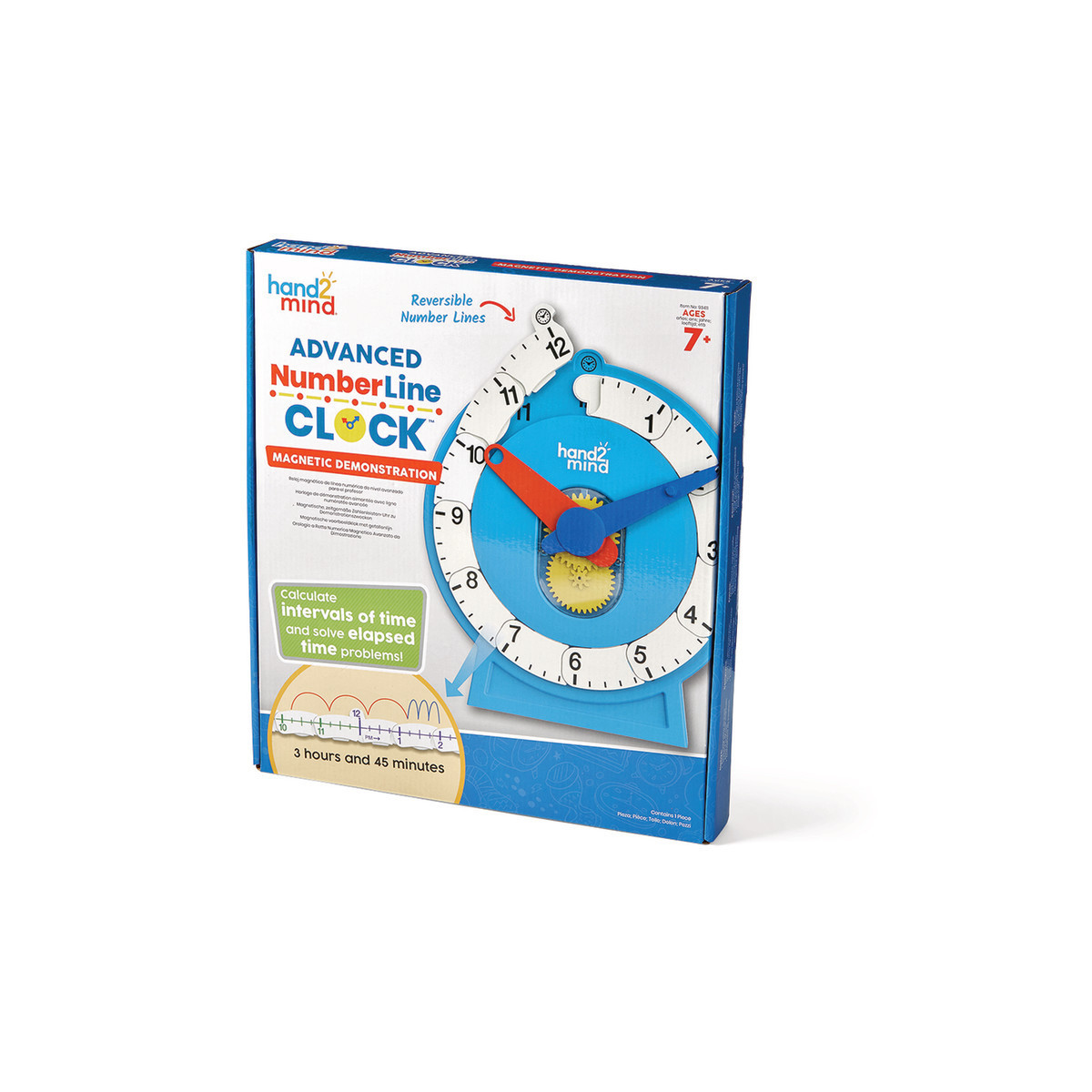 Calculate intervals of time and solve elapsed time problems with our Advanced NumberLine Clock™. It comes with a clock frame and 2 detachable numberline chains—1 for AM and 1 for PM. Simply unfold the number line chains, snap them together, and you've created a number line out of a clock. Gears maintain correct hour and minute relationship. Practice telling time on 3 different styles of analog clocks. Build your own 24-hour number line from a clock with color-coding for AM and PM. Use to calculate intervals of time and solve elapsed time problems.