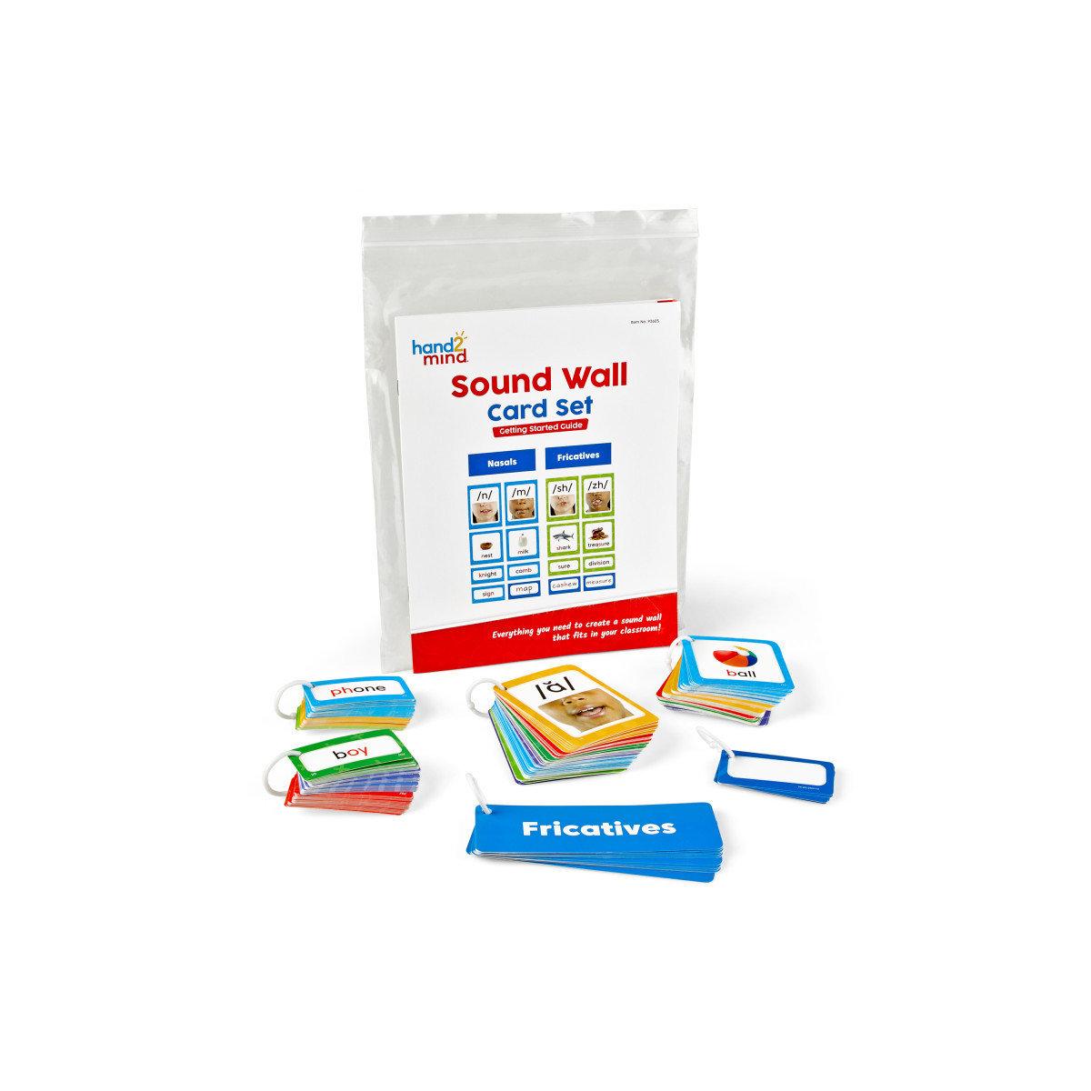 Our all-in-one Sound Wall Card Set includes everything teachers need to introduce a sound wall into their classrooms. Cards are organized on rings and sized so that the completed Sound Wall takes up less space in the average-size classroom. Phonics tools are great for young children, early readers, students with speech and language difficulties, and English language learners. Each wall comes with a Getting Started Guide that provides an outline of how to organize and use your sound wall along with blackline masters for a Consonant Chart and Vowel Valley. Includes 44 Phoneme Cards, 45 Grapheme/Photo Cards with the sound's most common spelling, 80 Spelling Cards showing alternative spellings of the sounds, 11 Header Cards, 10 Blank Write 'n' Wipe Cards, and 1 Getting Started Guide.