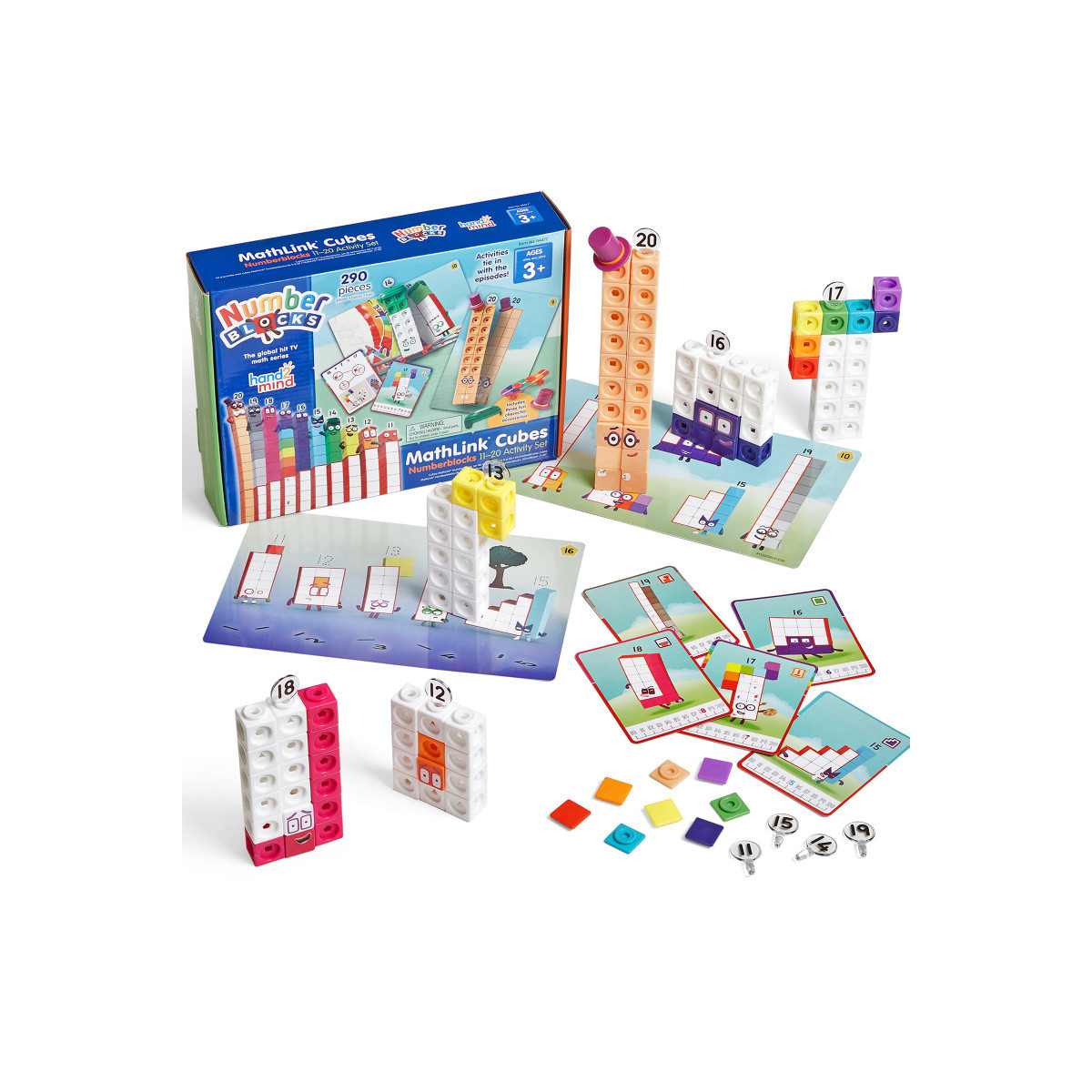 Children see how numbers really work as they build their own Numberblocks from One to Ten. Numberblocks are the friendly characters from the award-winning BBC TV series. Friendly TV series Numberblocks, an award winning show from BBC, brings math learning to life with Numberblocks MathLink Cubes! Children see how numbers really work as they build their own Numberblocks from One to Ten, by connecting them with classic mathlink cubes. Each set can build all the friendly characters from Numberblocks so you can follow along with the show, or play on your own! Each set includes 155 MathLink Numberblocks Cubes, 52 faceplates, 44 stickers, 10 numberlings, 10 character cards, 15 double-sided Write 'N' Wipe Activity Cards, Fourteen's Skateboard and Helmet, Twenty's Top Hat, 1 write and wipe pen and 1 activity guide.