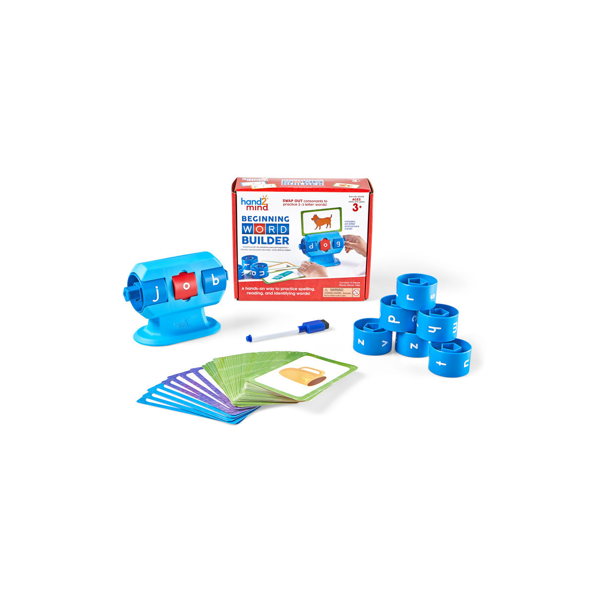 Turn learning to read into a fun, hands-on experience with the Beginning Word Builder. This engaging learning toy grows with children as their literacy skills develop. The durable letter wheels combined with the Activity Cards and games teach vowel-consonant (VC), consonant-vowel-consonant (CVC), and consonant-vowel (CV) words. Includes 1 Beginning Word Builder (center ring includes a, e, i, o, and u), 9 Removable Rings (8 consonant rings and 1 blank dry-erase ring), and 60 Dougle-Sided Word and Picture Cards.