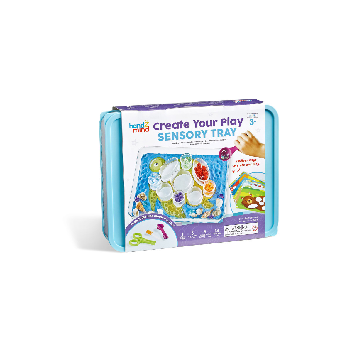 This versatile set encourages many hours of engaging, open-ended sensory exploration and loose parts play. The durable cups and tray work well with a variety of materials including, water, sand, water beads, and more. Included tools help strengthen fine motor muscles. Set includes one 3-piece tray, 3 fine motor tools, 8 double-sided activity cards and 14 reusable cups.