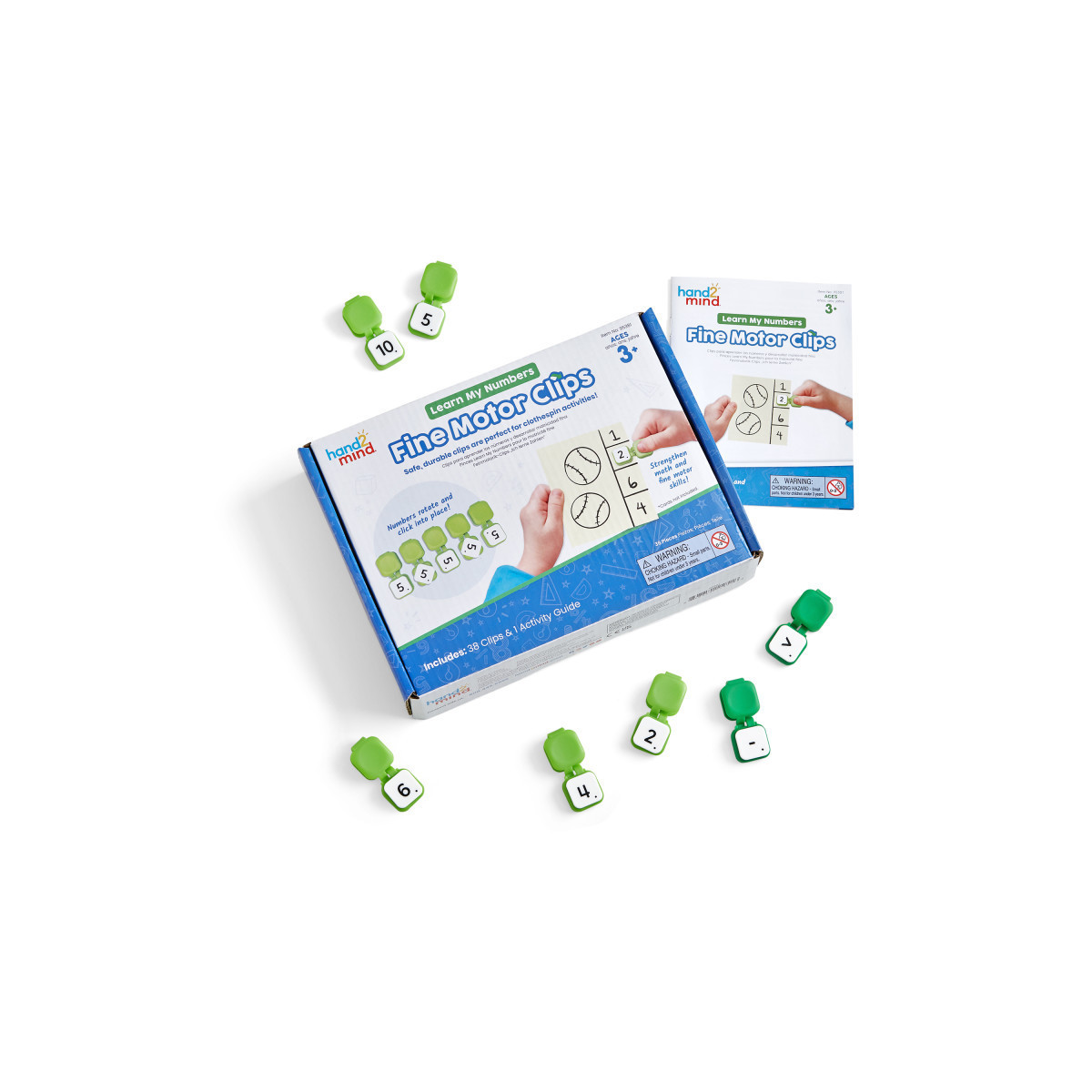These one-of-a-kind clips are designed with little hands in mind. They help children strengthen and refine their fine motor skills at the same time they're learning number recognition, counting, and other early math skills. Durable, ergonomic design helps with fine motor development. Easy-to-read numbers twist so you can use the clips in any orientation. Includes 38 clips and 1 activity guide.