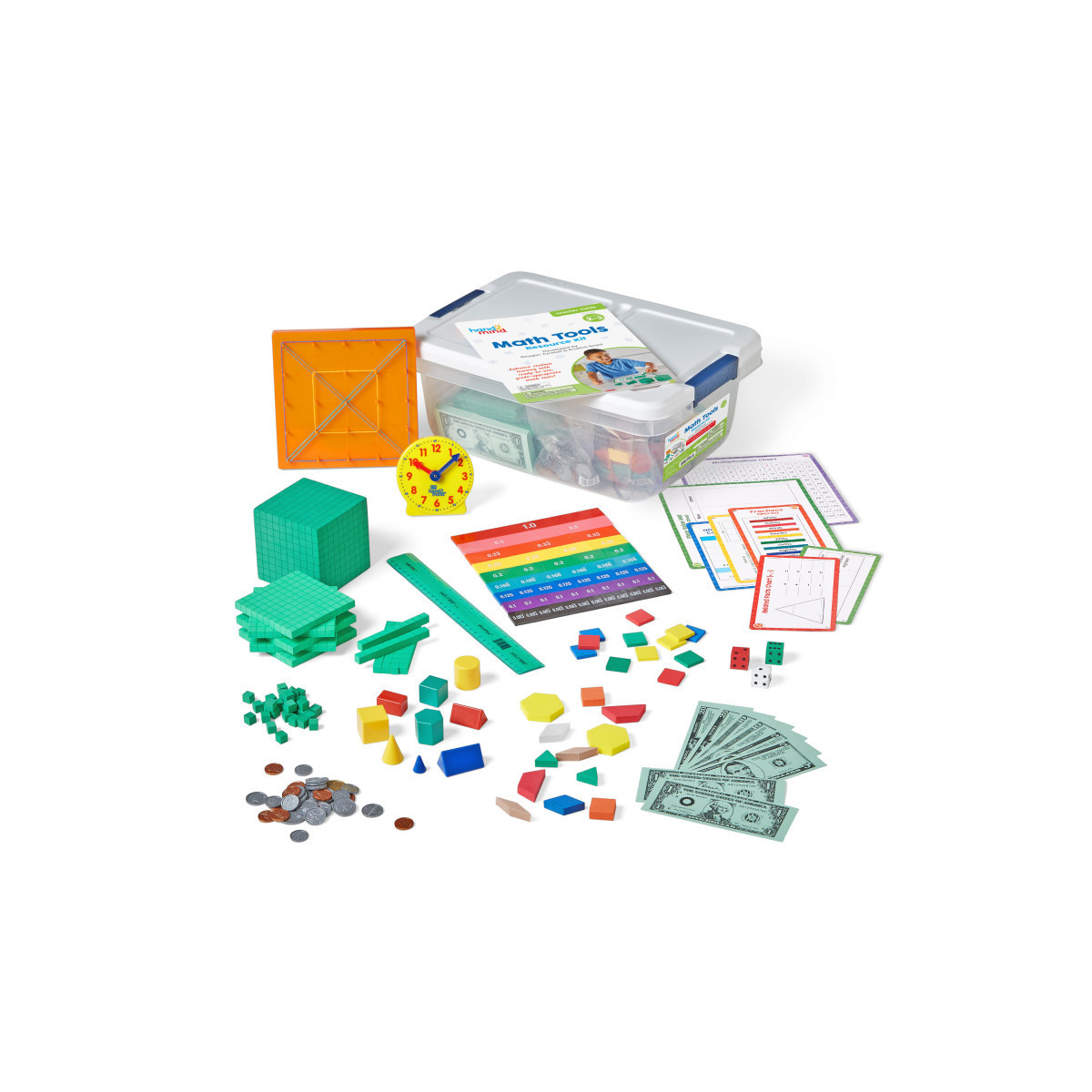 - Includes: Teacher Guide, 3 Card Sets, 1 Set of Coins, Paper Money, 200 Base Ten Units, 20 Base Ten Rods, 20 Base Ten Flats, 1 Base Ten Cube, 1 Set of GeoSolids®, 1 Geared Clock, 6 Dice, 100 Color Tiles, 1 Geoboard, 50 Pattern Blocks, 1 Set of Rainbow Fraction®/Decimal Tiles, 1 Ruler