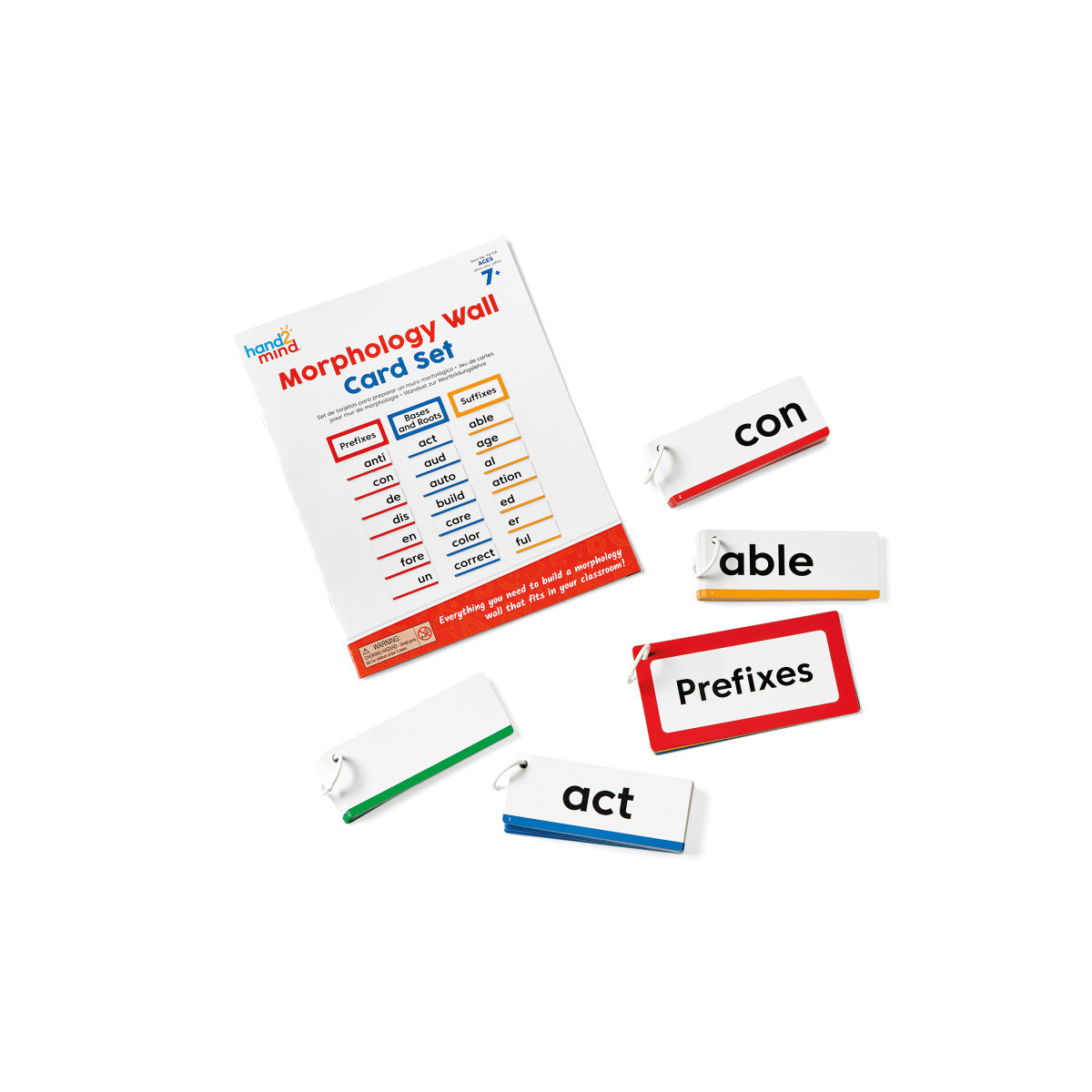 Our teacher-developed Morphology Wall Card Set provides an easy-to-use, interactive learning tool for your classroom! Morphology is the study of the formation of words as it relates to morphemes, the smallest meaningful unit of a word: prefixes, suffixes, bases, and roots. This comprehensive set provides the tools you need to construct a morphology wall that can be displayed and organized in a variety of ways. This morphology wall provides a framework for systematically and explicitly teaching individual morphemes and helping students identify and use them in their reading and writing. Includes 7 Header Cards (3"x6"), 20 Prefix Cards (2"x5"), 40 Base and Root Cards (2"x5"), 20 Suffix Cards(2"x5"), 20 Blank Write-on/Wipe-off Cards (2"x5"), 108 Peel and Stick Magnets (each magnet measures approx. 3/4"), and 1 Getting Started Guide.