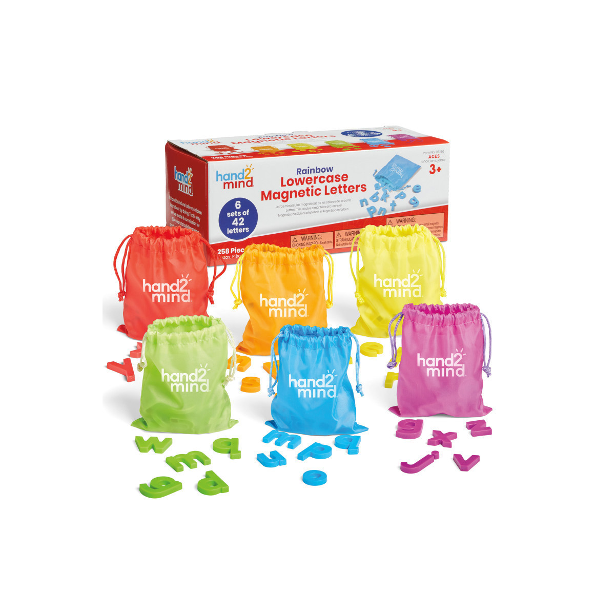 MAGNETIC LETTERS CLASS SET: This set contains 6 single-color sets. Includes a total of 252 Rainbow Lowercase Magnetic Letters and 6 Fabric Bags.