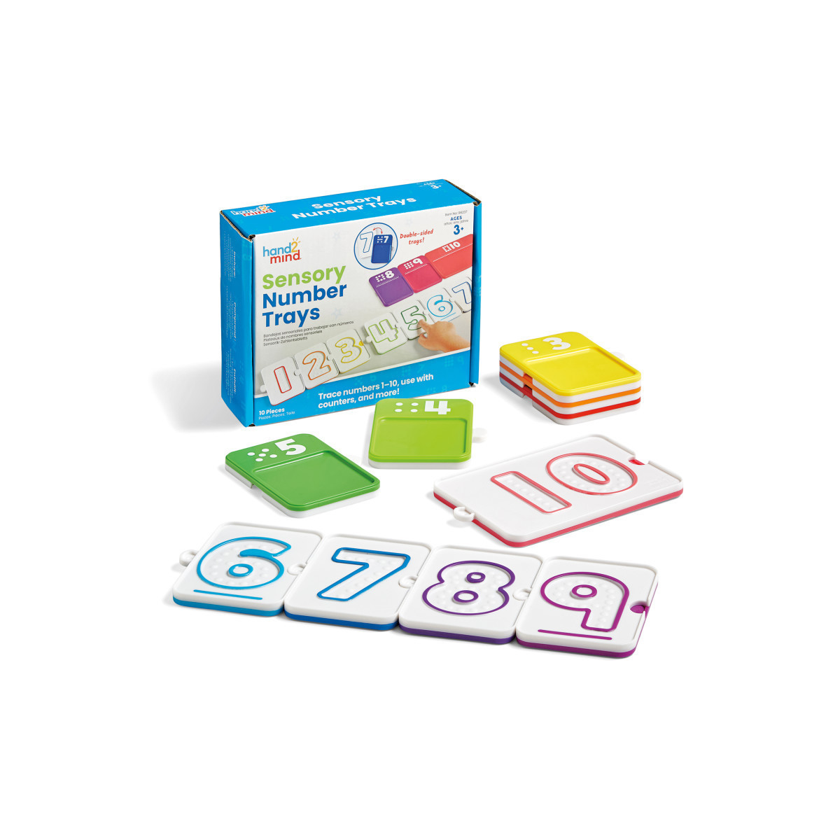 Explore the world of numbers with versatile Sensory Number Trays that provide an engaging, multisensory approach to early math skills! The traceable, textured finger paths help children connect to number shapes and build prewriting skills—and the open space is perfect for using manipulatives and counters. Different representations of numbers allow children to deepen their number sense as they practice number formation, sequencing, and more. Includes 10 Double-sided Number Trays and 1 Activity Guide.