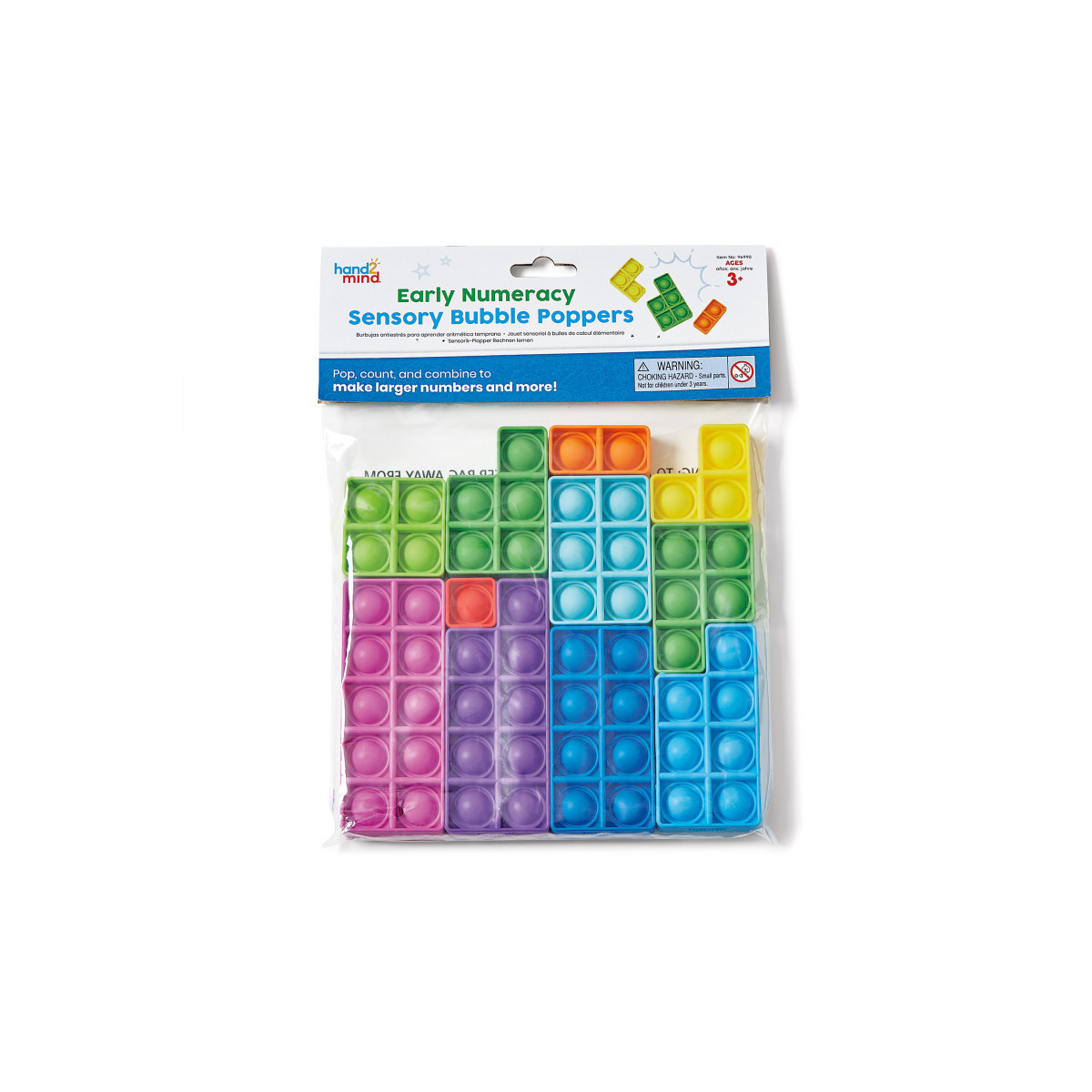 Pop, count, and combine to make larger numbers and more! Empower children to easily remember and grasp math concepts through multisensory learning. Construct and deconstruct various number models with the flexible sensory manipulatives. Each colorful bubble popper is designed with a unique shape that matches its unique number. Practice counting, making ten, addition, subtraction, and more! These tactile manipulatives can help children explore counting, making ten, addition, subtraction, fractional concepts, and more. The Early Numeracy Sensory Bubble Poppers are perfect for centers, intervention, and early finishers. Help children learn basic math skills, while also helping them focus and improve their fine motor skills. Doubles as both a math tool and an anxiety, fidget toy! The long-lasting design is easy to clean and portable. This set includes 11 Early Numeracy Sensory Bubble Poppers.