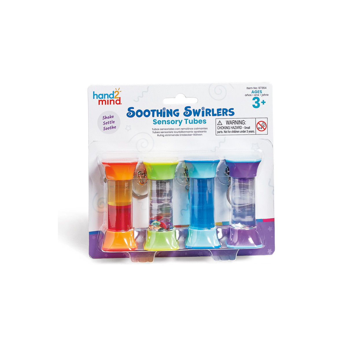 Shake, settle, and soothe with this mesmerizing set of mini sensory fidget tubes! Each easy-to-grip, securely sealed bottle is filled with unique sensory materials and designed to be stackable. Includes key chains to easily attach to a backpack or key ring. Help children calm down, focus, and relax in the classroom, at home, or on-the-go. This set includes 4 Soothing Swirlers Sensory Tubes– Color Mix, Glittering Gems, Serene Swirl, Soothing Sand and Glitter.