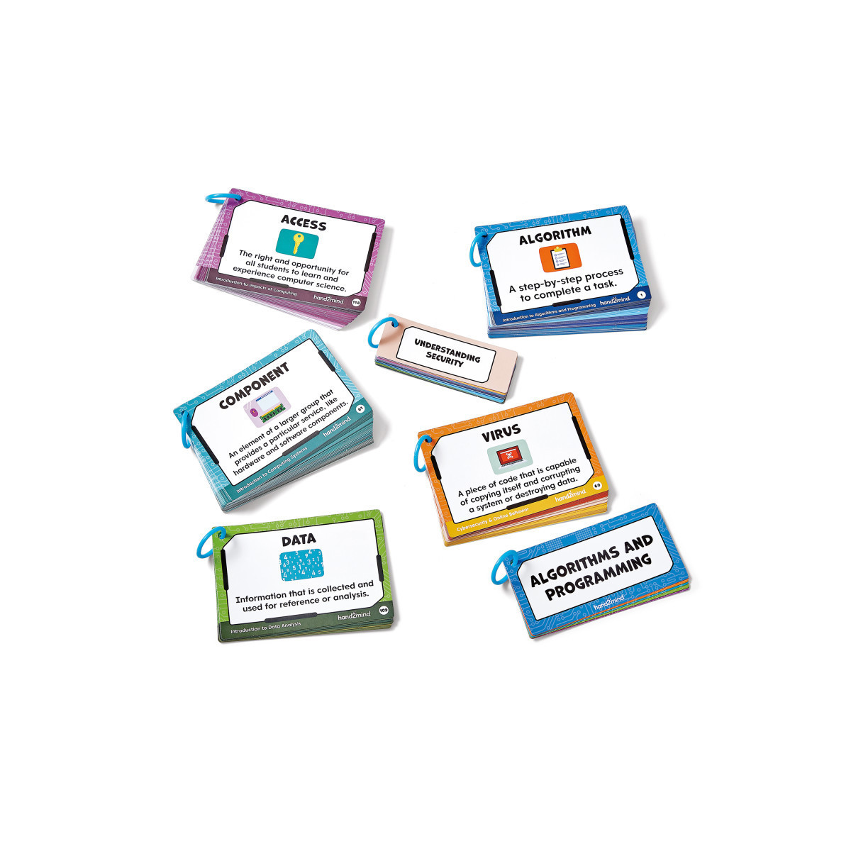 Enhance computer science instruction with the Computer Science Word Wall Set, an interactive learning tool designed to build digital literacy and vocabulary skills. Covering essential topics from hardware and software to programming and coding, this set includes 150 single-sided vocabulary cards with images and definitions. Color-coded by five key domains—Algorithms and Programming, Networks and the Internet, Computing Systems, Data Analysis, and Impacts of Computing—this word wall provides a scaffolded approach to learning complex concepts. The cards are conveniently organized on durable rings and can be displayed using 348 included peel-and-stick magnets, allowing for a customizable classroom setup. Ideal for beginner and intermediate learners, this set helps students precisely identify and use key computer science terms, preparing them for academic and real-world success. The comprehensive set includes 5 domain header cards, 19 category cards, and a Getting Started Guide, making it an essential resource for any STEM-focused classroom!